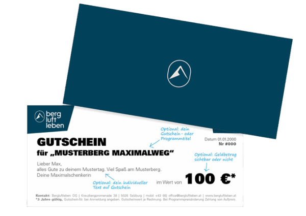 Bergluftleben kannst du auch als Gutschein verschenken. Der Gutschein ist individuell gestaltbar (siehe blaue Notizen im Bild unten). Du bekommst den Gutschein per E-Mail als Pdf zum selbst ausdrucken.