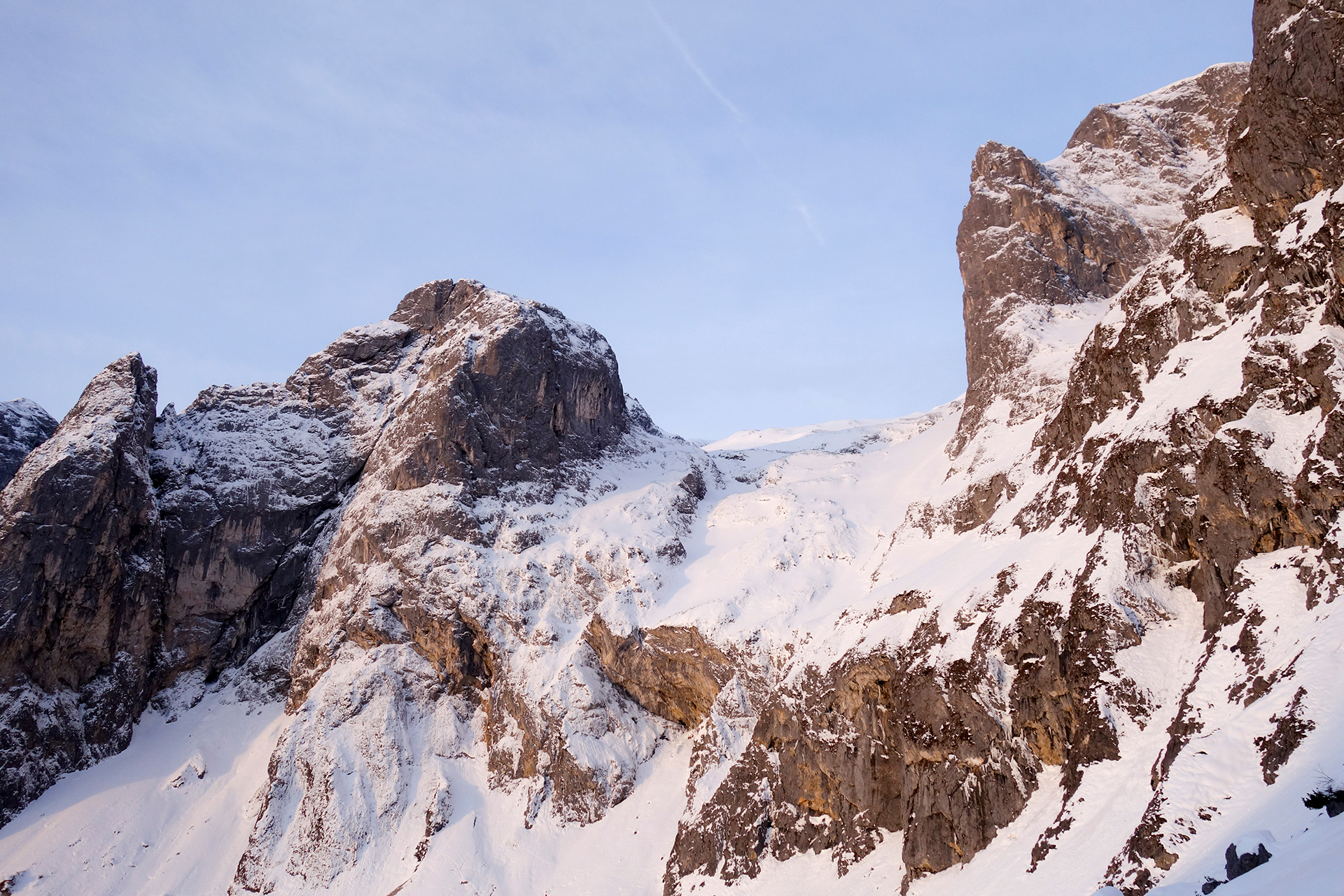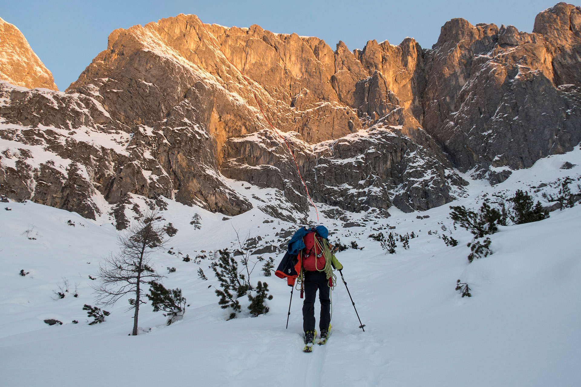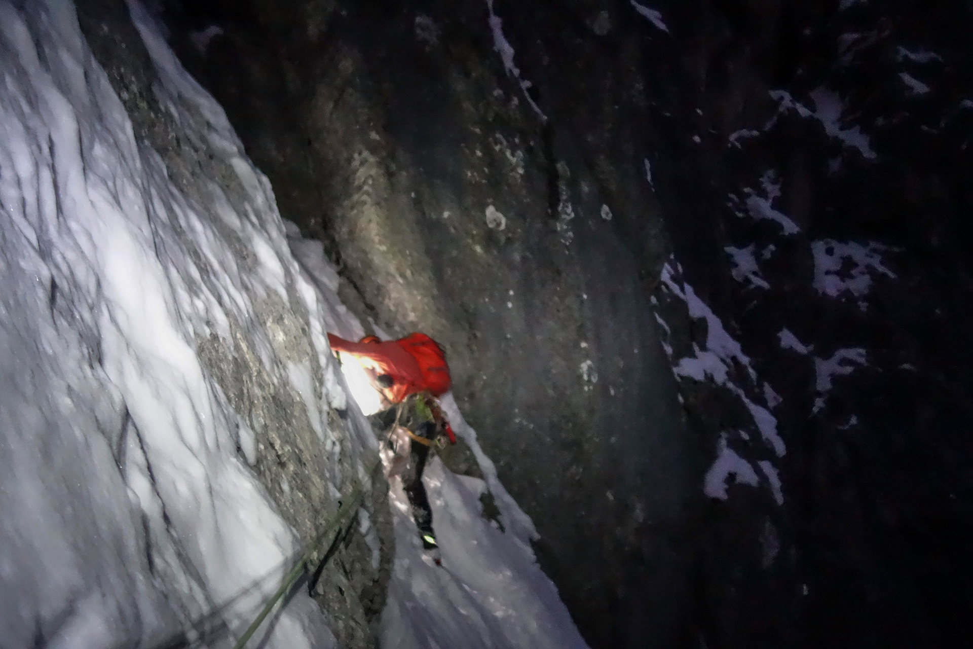 Mit den Tourenski gelangten wir schnell an den vom Sonnenaufgang gerade blutorange gefärbten Wandfuß. Raus aus den Skischuhen, rein in die Bergschuhe, ein letzter prüfender Blick in den Himmel, ob auch wirklich die angekündigten Wolken kommen, eine kurze bestärkende Diskussion über unsere Einschätzung der aktuellen Situation und schon fanden wir uns nach kurzer Stapferei am Einstieg dieser gewaltigen Linie. Timo startete beherzt in die erste Länge. Die Schwierigkeit der Kletterei und die vorherrschenden Verhältnisse nahmen sich die Zeit, die für ein solides Klettern benötigt wurde. Es zeigte sich schnell, dass es wohl länger dauern würde als gedacht.
