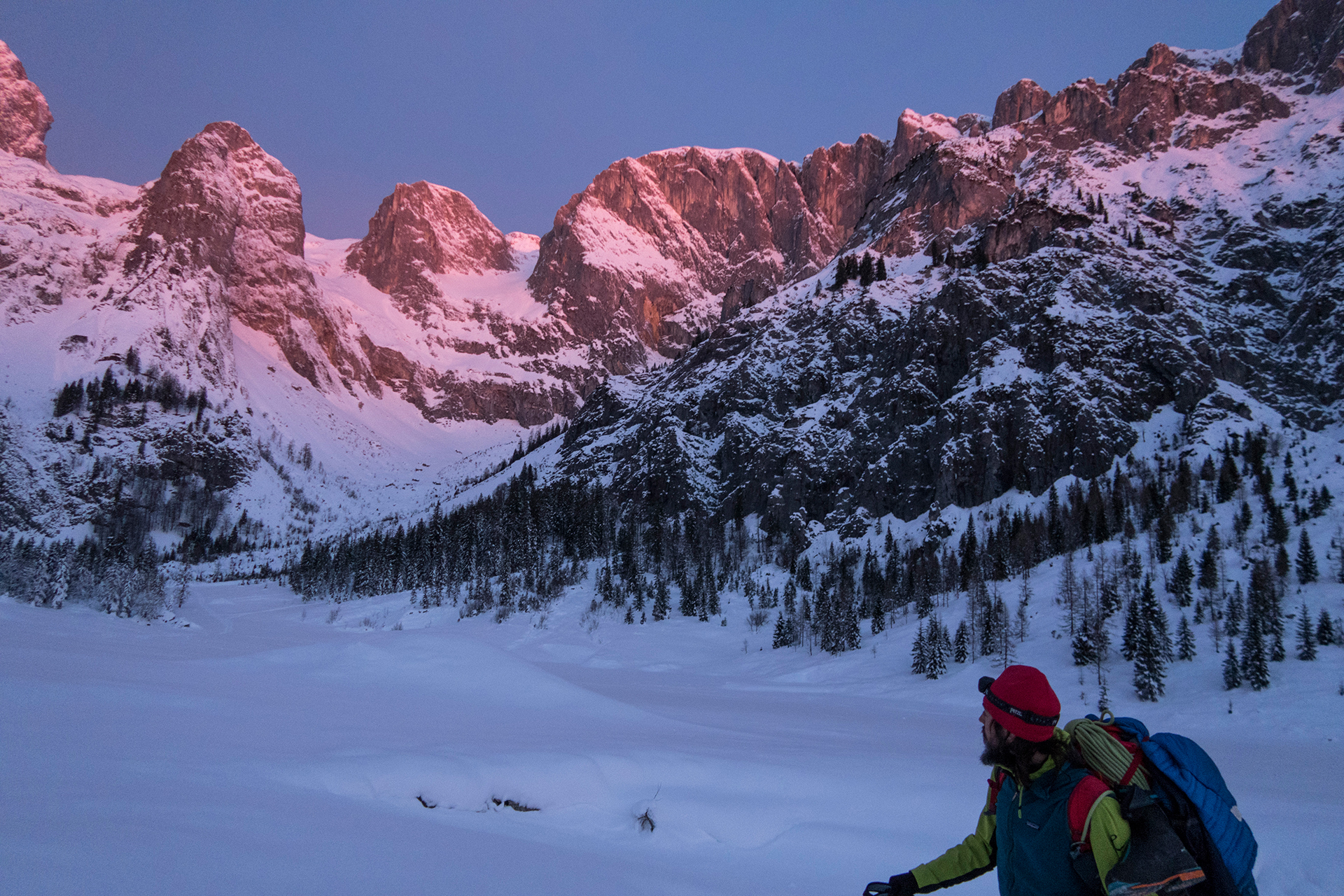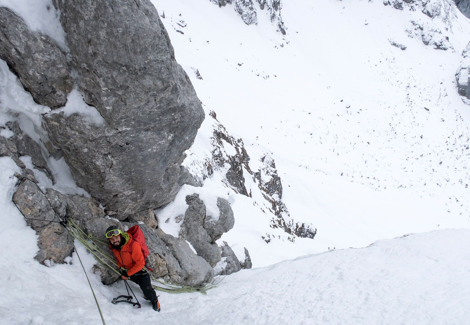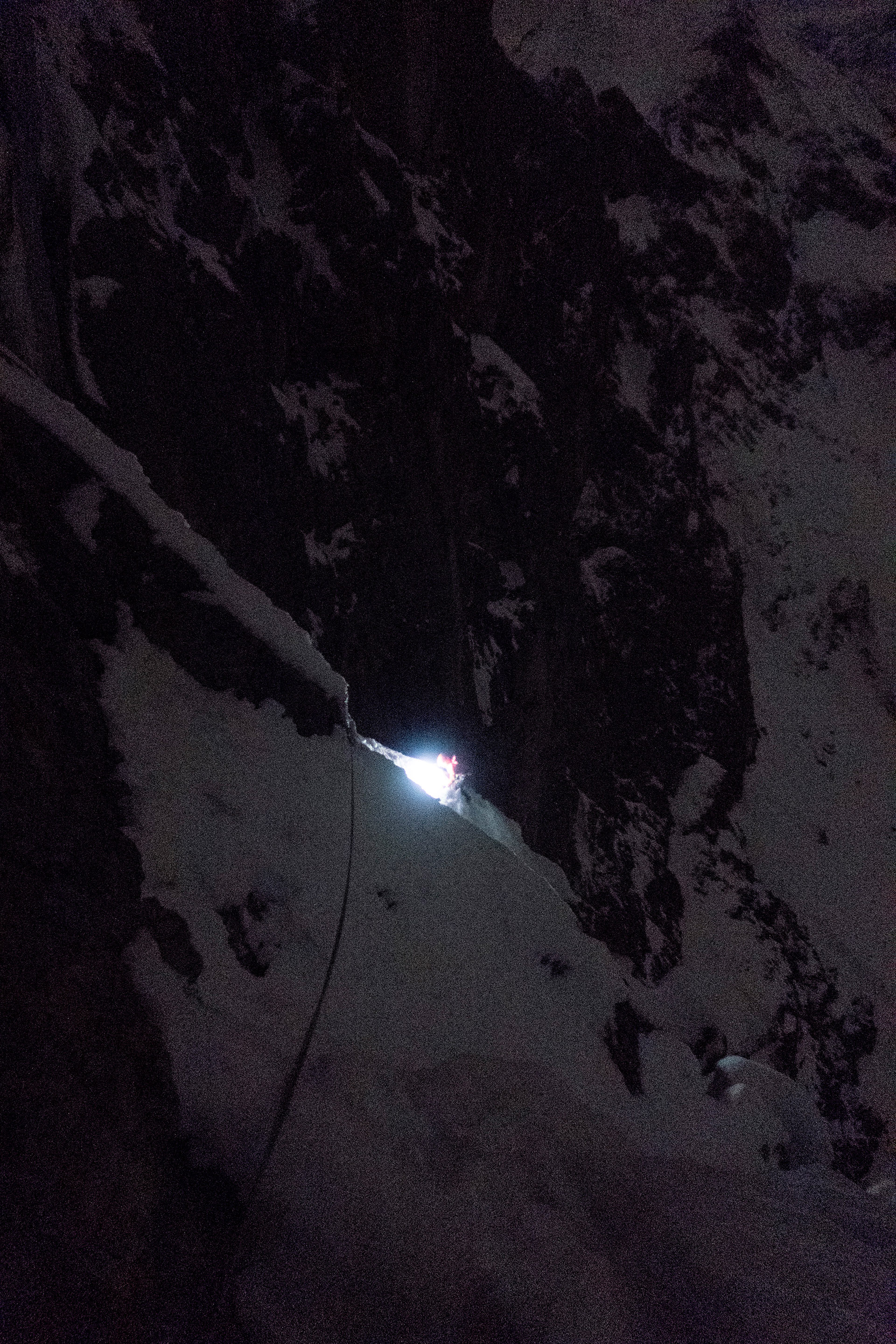 Mit den Tourenski gelangten wir schnell an den vom Sonnenaufgang gerade blutorange gefärbten Wandfuß. Raus aus den Skischuhen, rein in die Bergschuhe, ein letzter prüfender Blick in den Himmel, ob auch wirklich die angekündigten Wolken kommen, eine kurze bestärkende Diskussion über unsere Einschätzung der aktuellen Situation und schon fanden wir uns nach kurzer Stapferei am Einstieg dieser gewaltigen Linie. Timo startete beherzt in die erste Länge. Die Schwierigkeit der Kletterei und die vorherrschenden Verhältnisse nahmen sich die Zeit, die für ein solides Klettern benötigt wurde. Es zeigte sich schnell, dass es wohl länger dauern würde als gedacht.