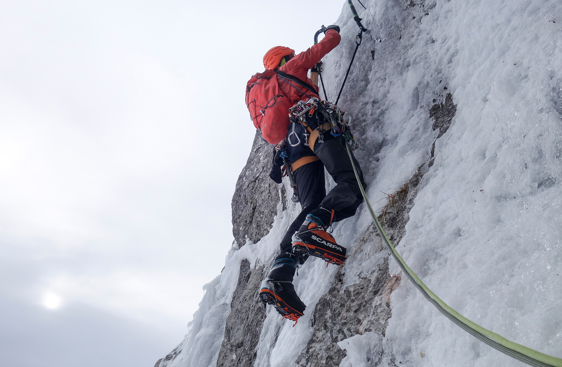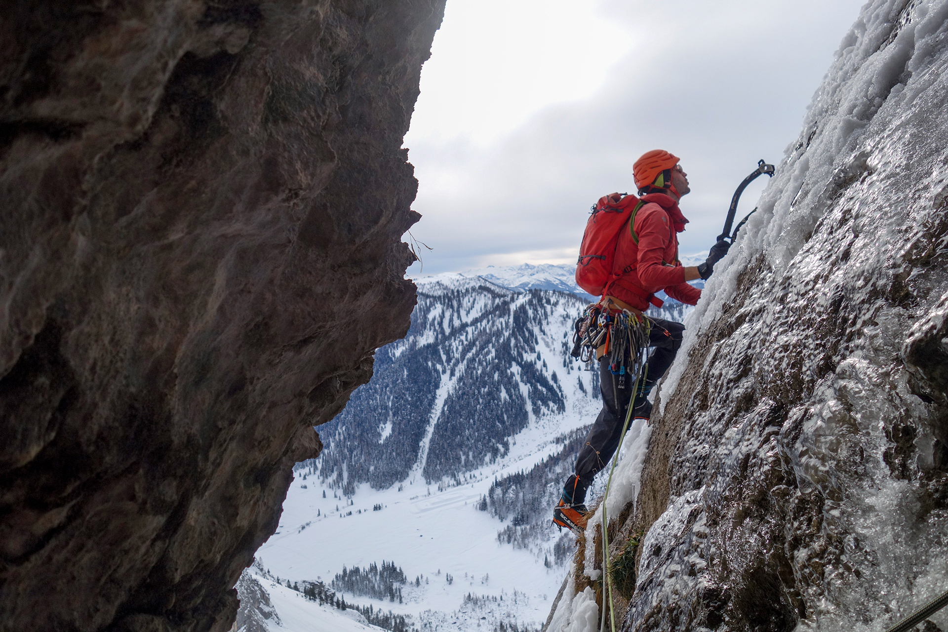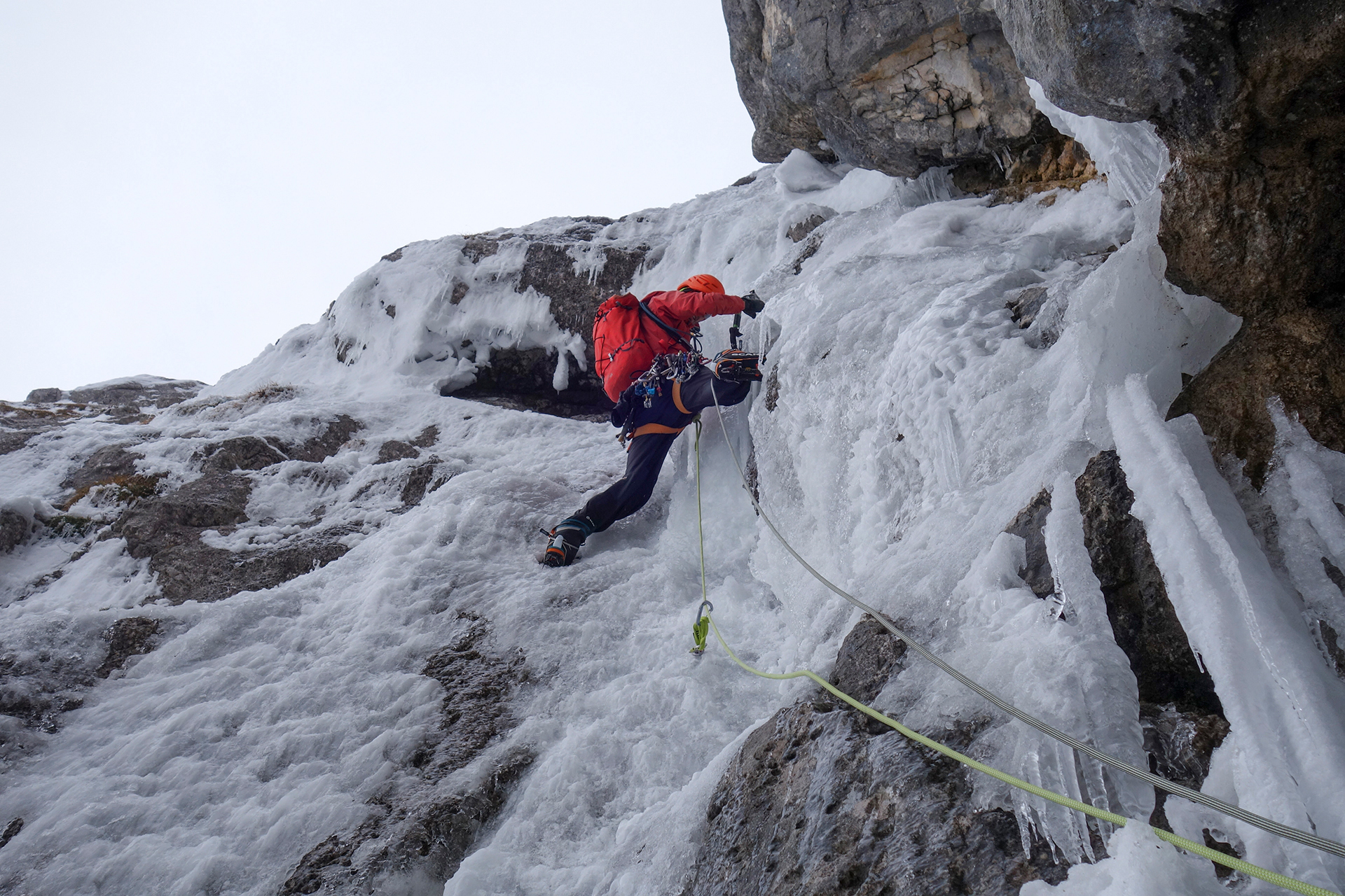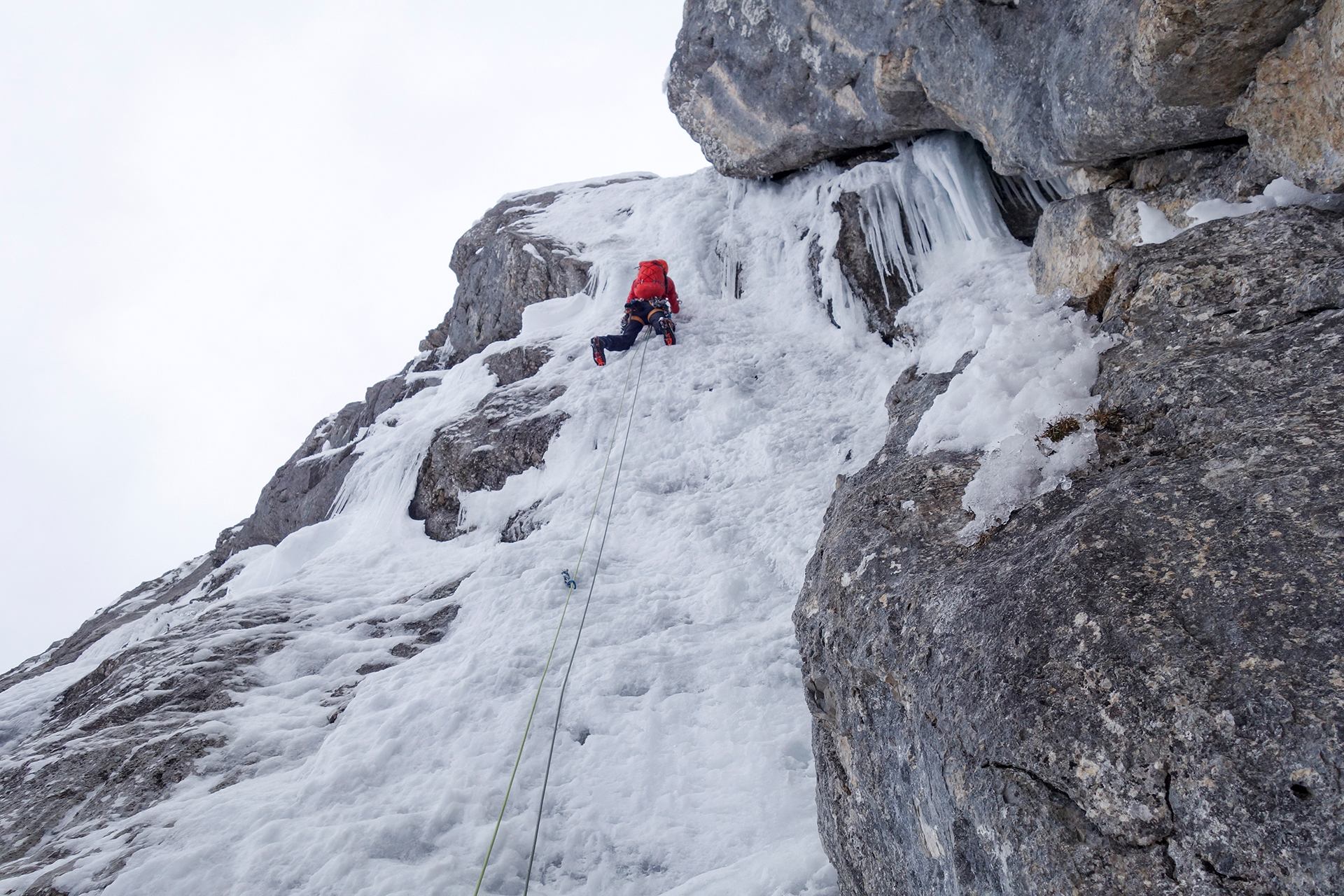 „…bei einer Erstbegehung im Eis in einer winterlichen südseitigen 550 m-Wand aus Kalkgestein müssen schon sehr viele Faktoren zusammenpassen, […] „