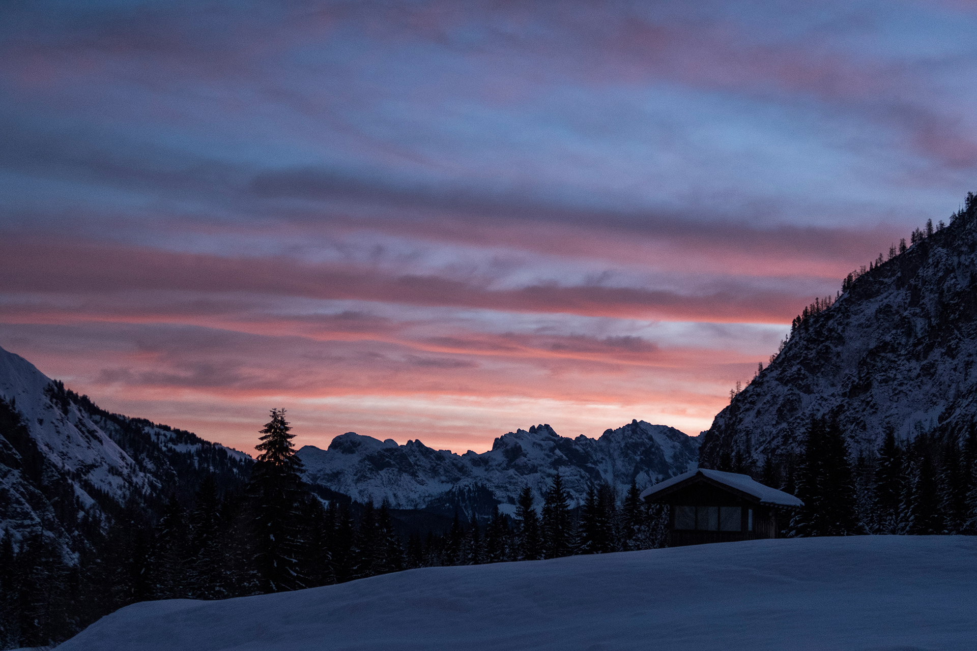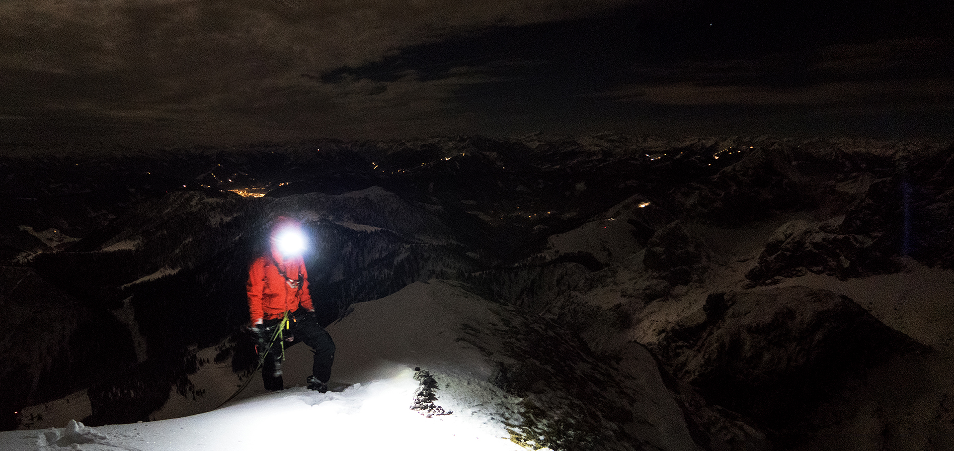Beim Ausstiegsfinale aus der Tour wurden wir zu unserer Begeisterung von einem hell erleuchteten Mond- und Sternenhimmel begleitet. Bei besten Schneeverhältnissen stapften wir im Schein des Mondes über das in winterliche Stille erstarrte Tennengebirge. Und selbst bei der Abfahrt durften wir noch ein paar Schwünge in den im Stirnlampenlicht funkelnden Pulverschnee zeichnen – einfach unglaublich. Als wir wieder zurück ans Auto kamen, war es bereits 22.00 Uhr. Aber was sind schon 14 Stunden im Flow? Ein Augenblick zauberhafter Vergänglichkeit?