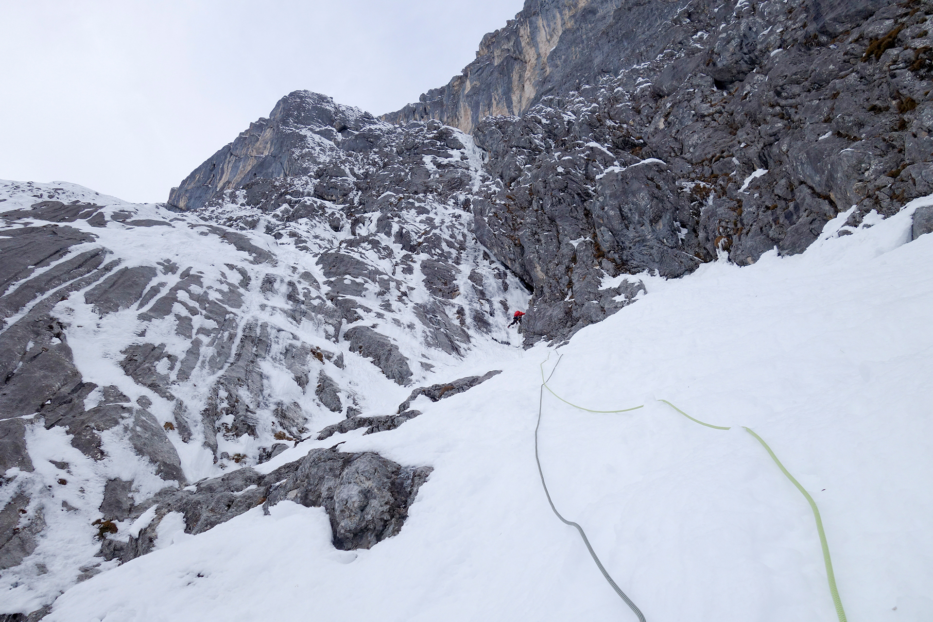 Da die Sonne perfekt von den Wolken verhangen war und es wohl nicht zu warm werden würde, entschieden wir, in sich gegenseitig beflügelnder Seilschaftsperformance weiter zu gehen. Timo jauchzte somit Länge für Länge solide hinauf und durfte kreativ die Stände in die Felsnischen zimmern. Ich kletterte zügig hinterher und war dabei nicht weniger begeistert. Die Kletterei war genial anregend abwechselnd, tolle Eis-Fels-Verschneidungen, für uns noch nie dagewesene vereiste Wasserrillen, Glasuren wie aus Zuckerguss, mal mehr, mal weniger Eis, dazwischen kombiniertes Graspolstermosaik und Schneeeinlagen von trittfest bis wühlbar weich. Und das alles auch noch gut abzusichern. Mixedklettern à la carte.