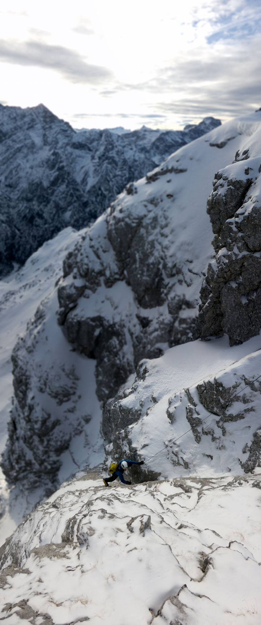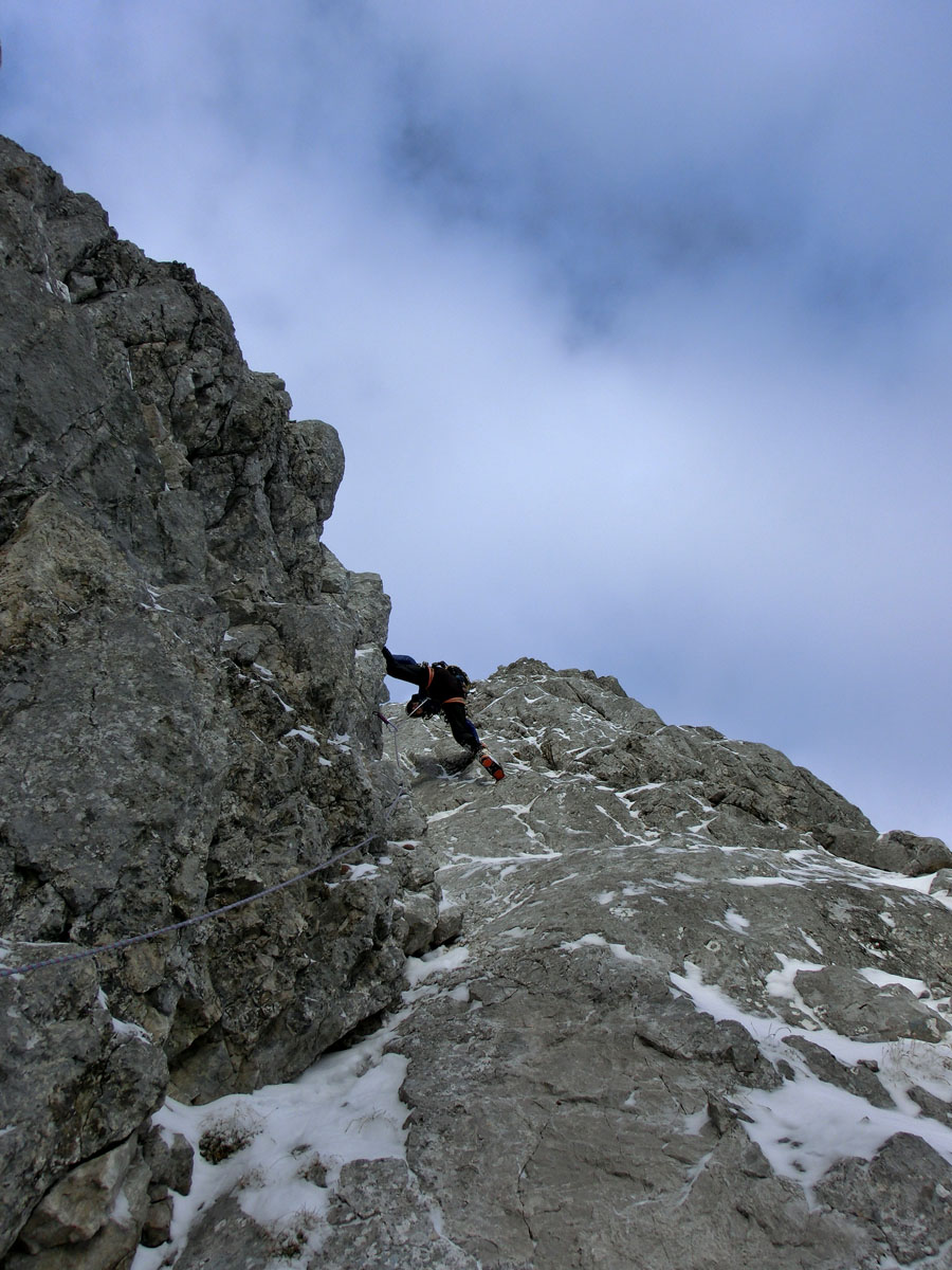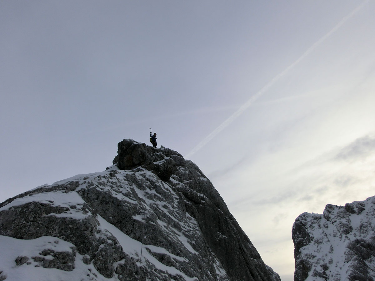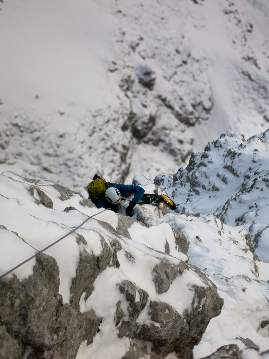 Ben und ich kletterten am 16.01’14 den Großteil der Blaueisumrahmung. Das anfänglich beim Zustieg total schneefreie Gelände, wurde spätestens ab der Blaueishütte tief winterlich. Der Grat und die Kletterei präsentierte sich dann verschneit und durch eine leichte Bewölkung von seiner kühlen, winterlichen Seite. In einsamen Ambiente stapften und kletterten wir zuerst über die Schärtenspitze und weiter über die Blaueisspitze zur Blaueisscharte.