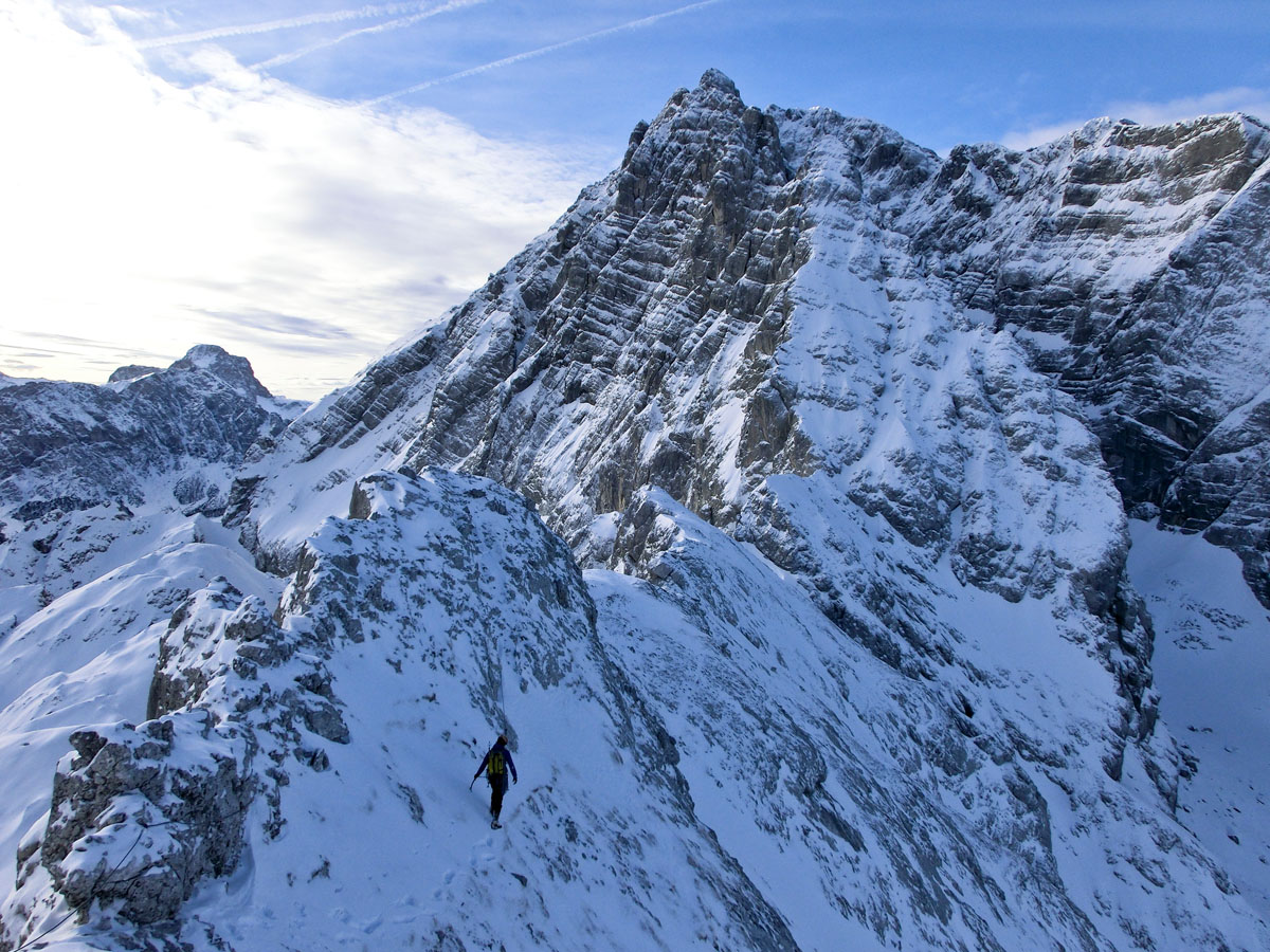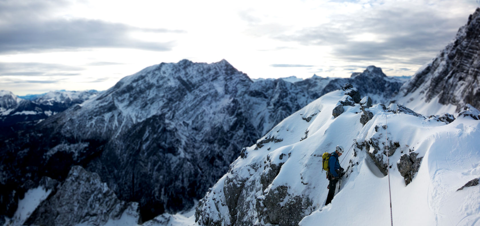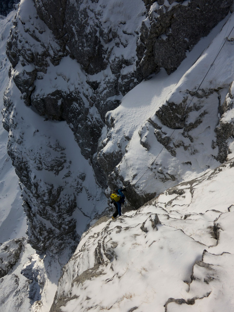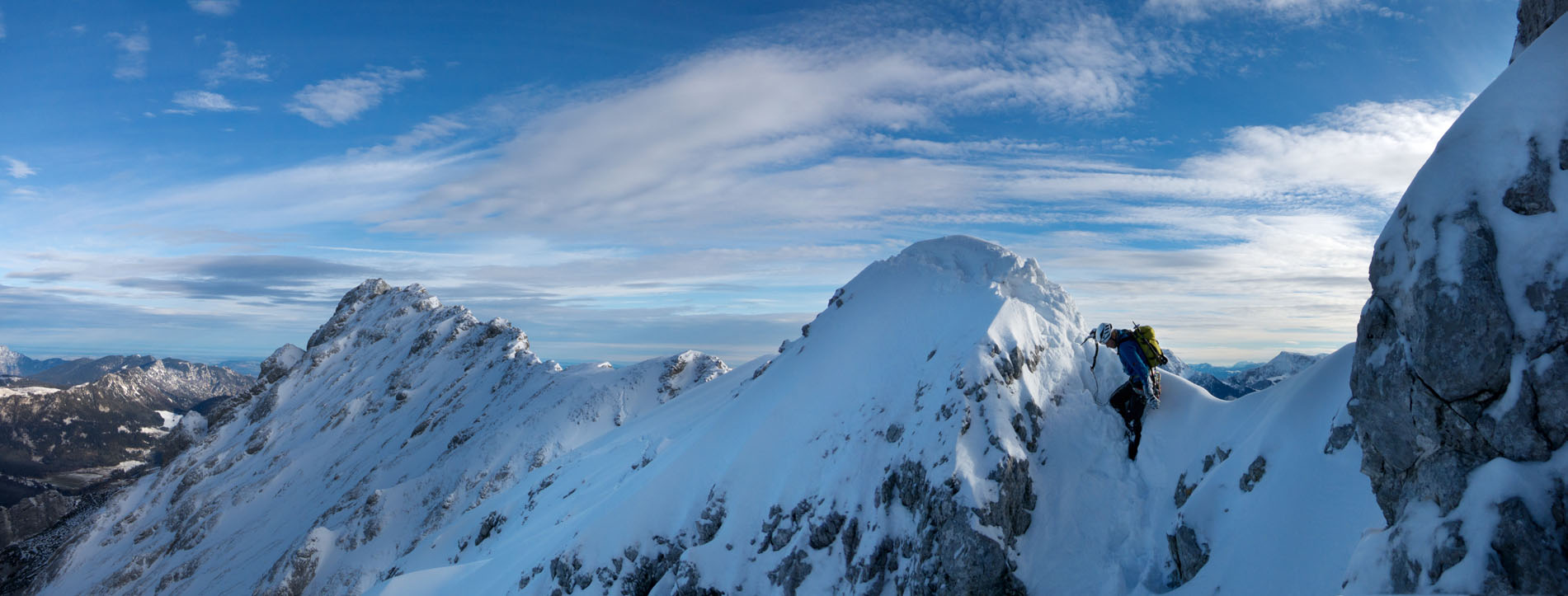 Ben und ich kletterten am 16.01’14 den Großteil der Blaueisumrahmung. Das anfänglich beim Zustieg total schneefreie Gelände, wurde spätestens ab der Blaueishütte tief winterlich. Der Grat und die Kletterei präsentierte sich dann verschneit und durch eine leichte Bewölkung von seiner kühlen, winterlichen Seite. In einsamen Ambiente stapften und kletterten wir zuerst über die Schärtenspitze und weiter über die Blaueisspitze zur Blaueisscharte.