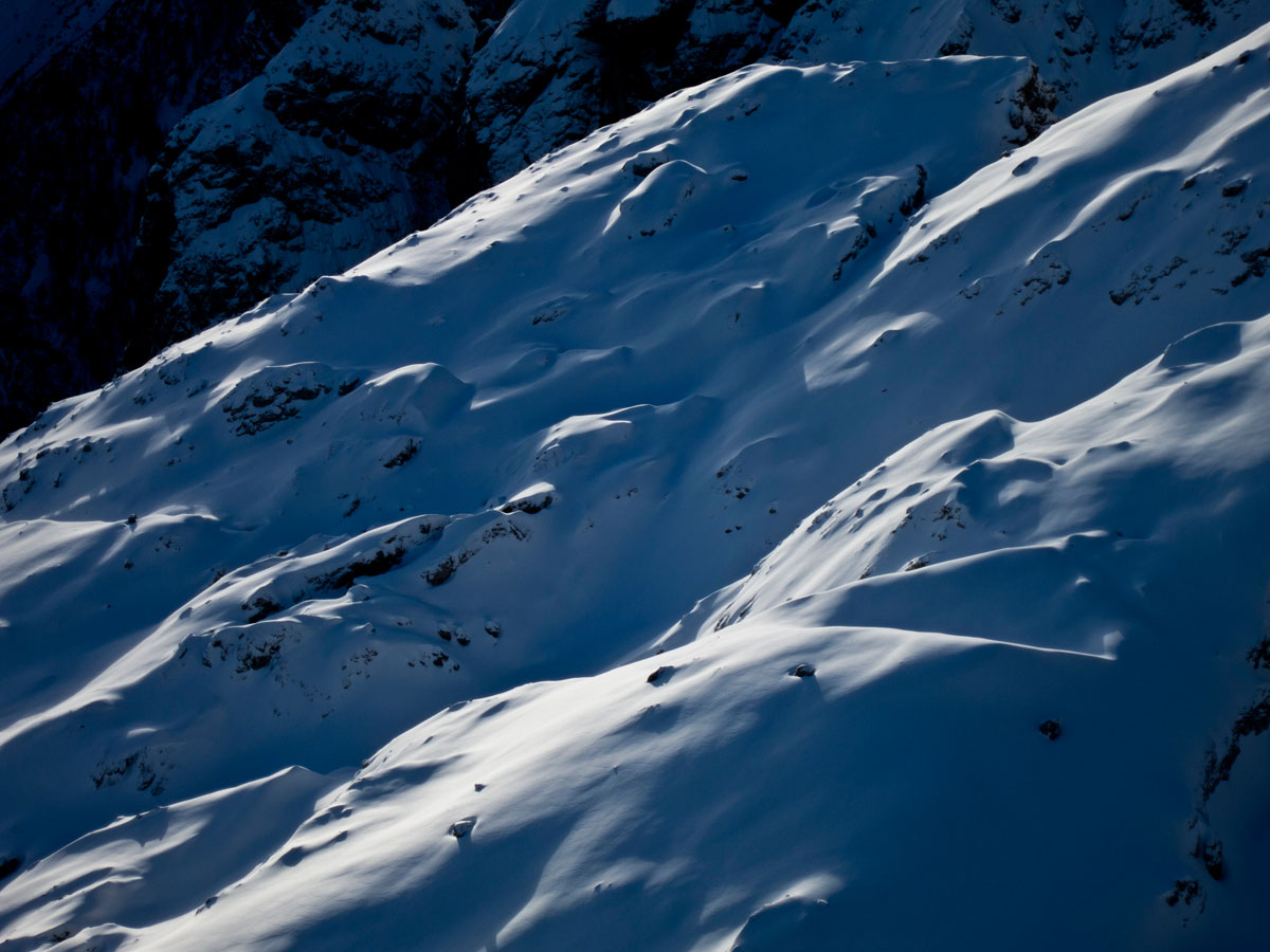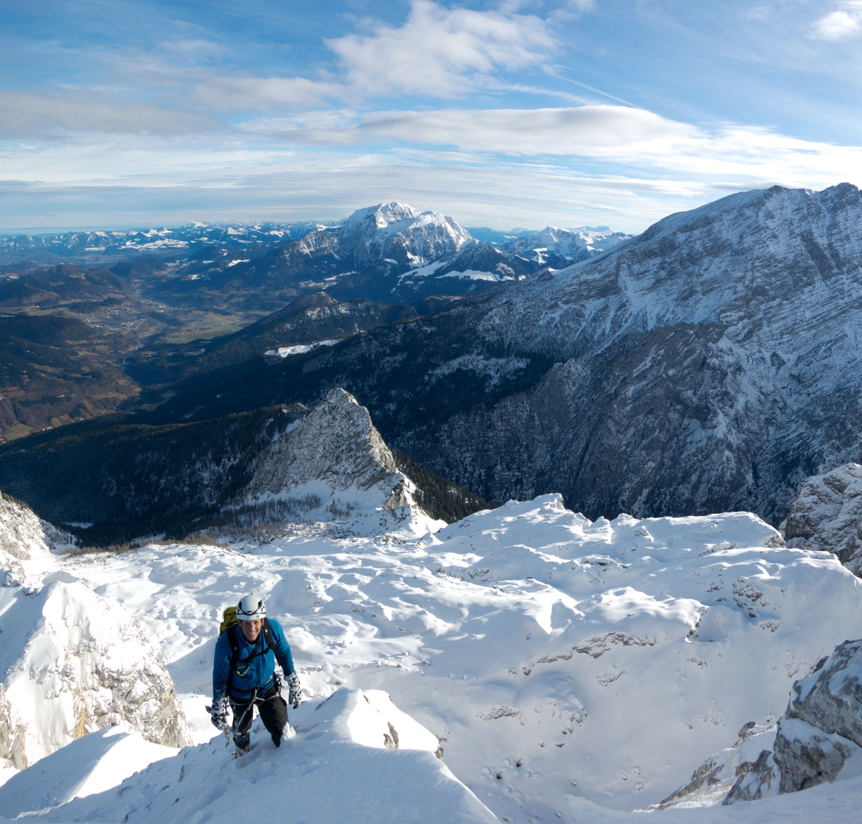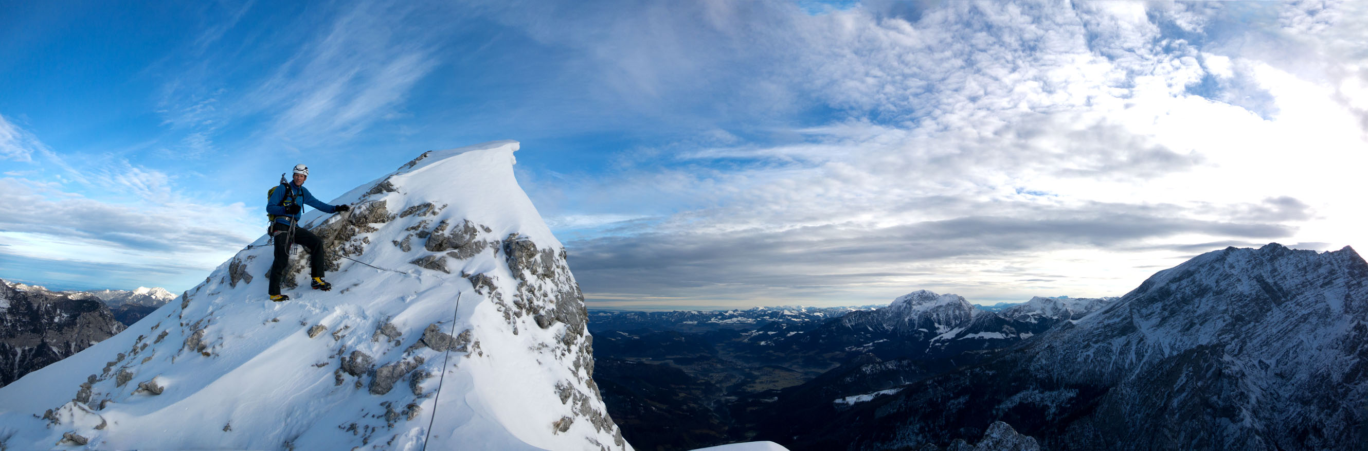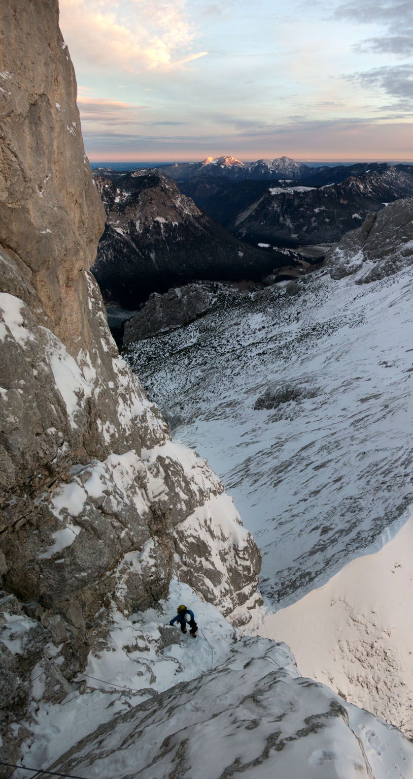 Ben und ich kletterten am 16.01’14 den Großteil der Blaueisumrahmung. Das anfänglich beim Zustieg total schneefreie Gelände, wurde spätestens ab der Blaueishütte tief winterlich. Der Grat und die Kletterei präsentierte sich dann verschneit und durch eine leichte Bewölkung von seiner kühlen, winterlichen Seite. In einsamen Ambiente stapften und kletterten wir zuerst über die Schärtenspitze und weiter über die Blaueisspitze zur Blaueisscharte.