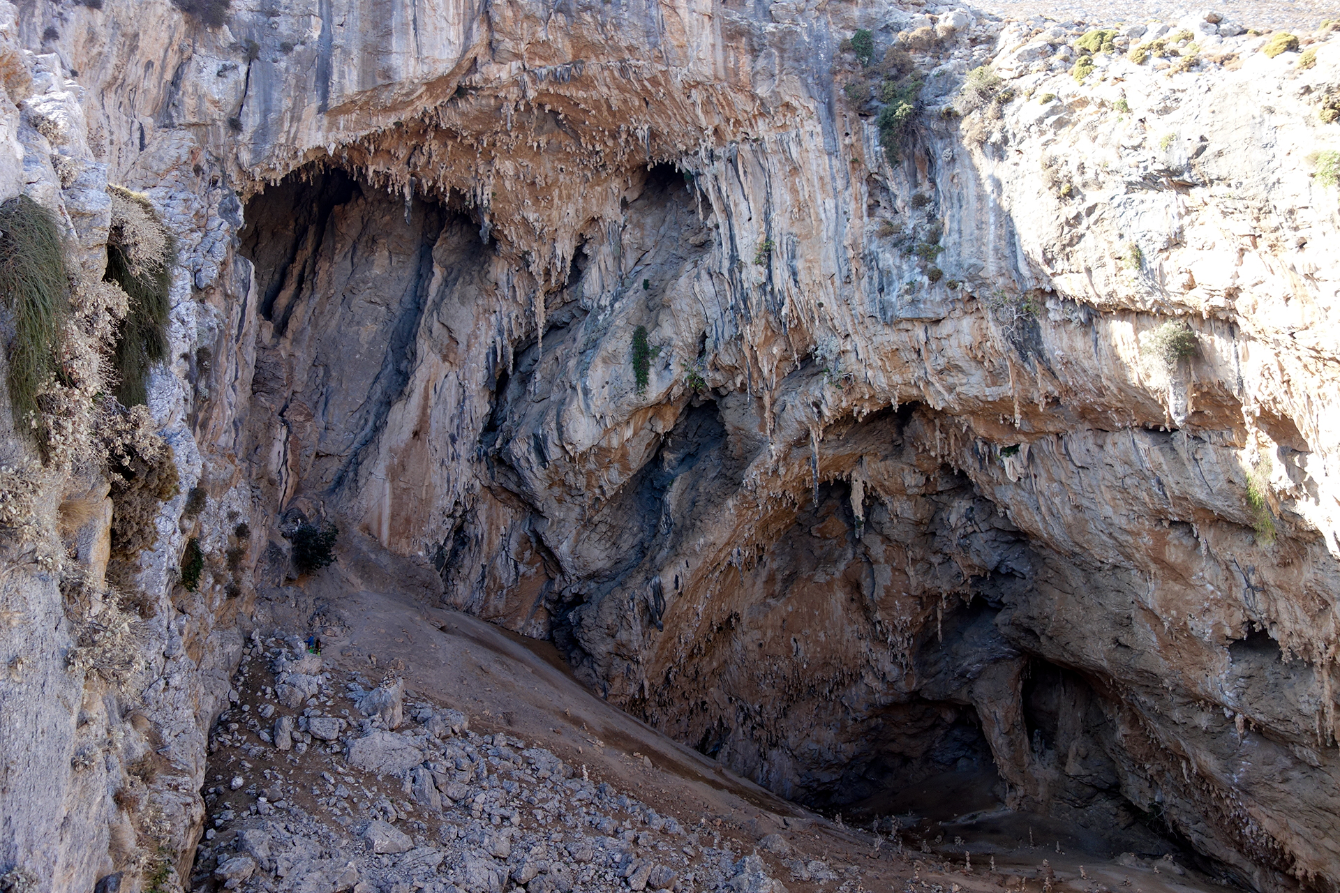 Dieses Gebiet ist direkt über dem Ort mit einer, wie der Name schon sagt, riesigen Grotte mit unglaublichen Stalaktiten. Hier gibt es Routen wie z.B. die Route Priapos, die durch das gesamte Höhlendach zieht und man ca. 30 m vom Einstieg entfernt wieder unten ankommt.