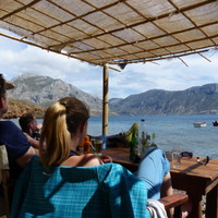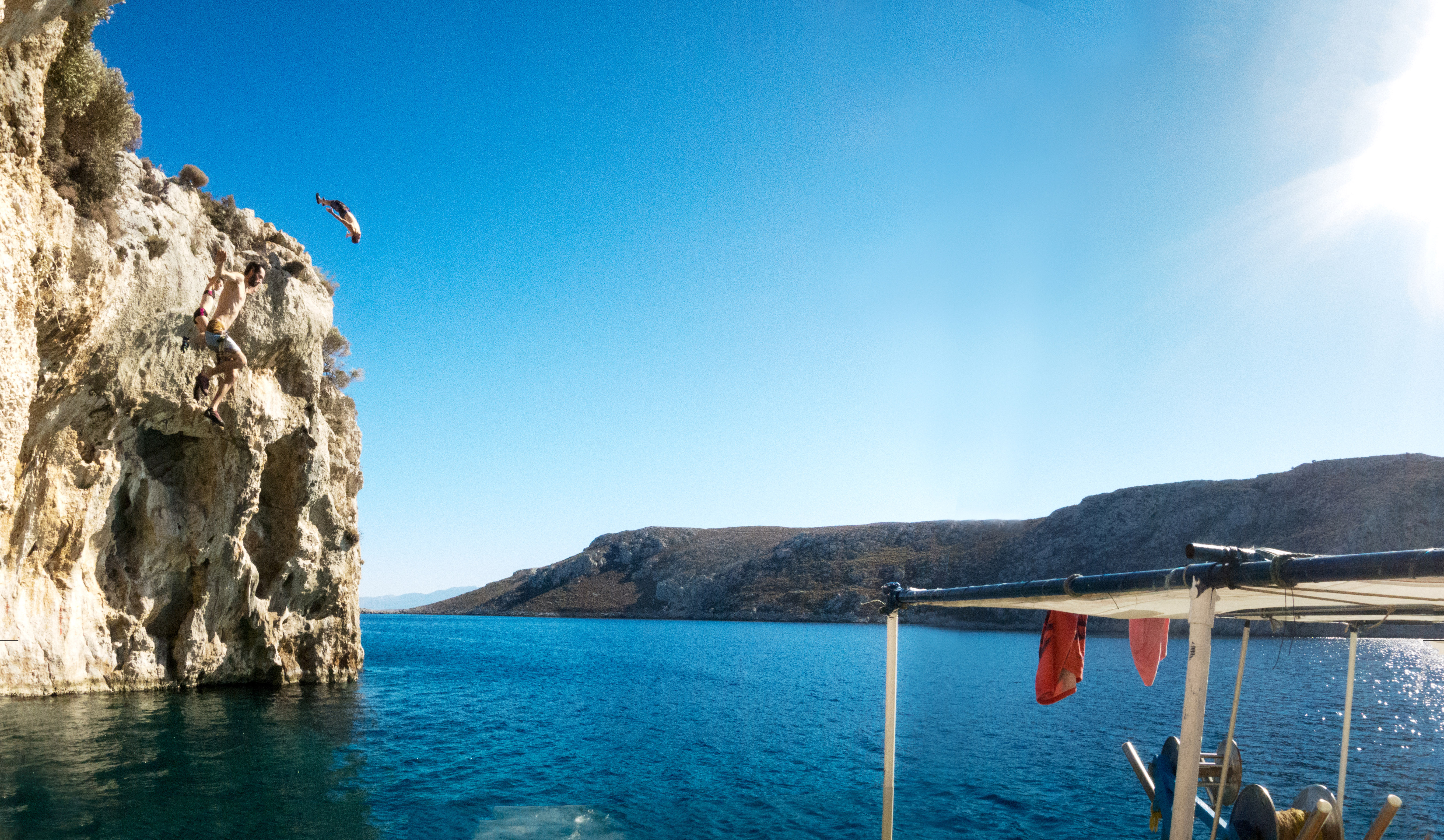 Eine super Abwechslung ist das moderate Deep Water Soloing in Rina. Für ca. 10 €/Stunde kann ein Boot geliehen werden und man wird dann direkt zur Felswand gefahren. Man kann hier an einer ca. 12 m hohe Grotte mit ca. 5 Routen klettern bzw. ins Wasser springen. Es gäbe auch ein kleines Gebiet direkt am Wasser, wo mit Seil vom Boot aus geklettert wird.