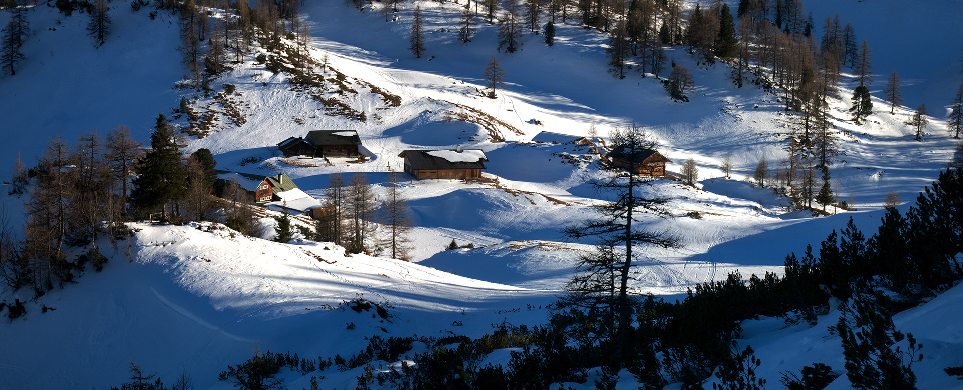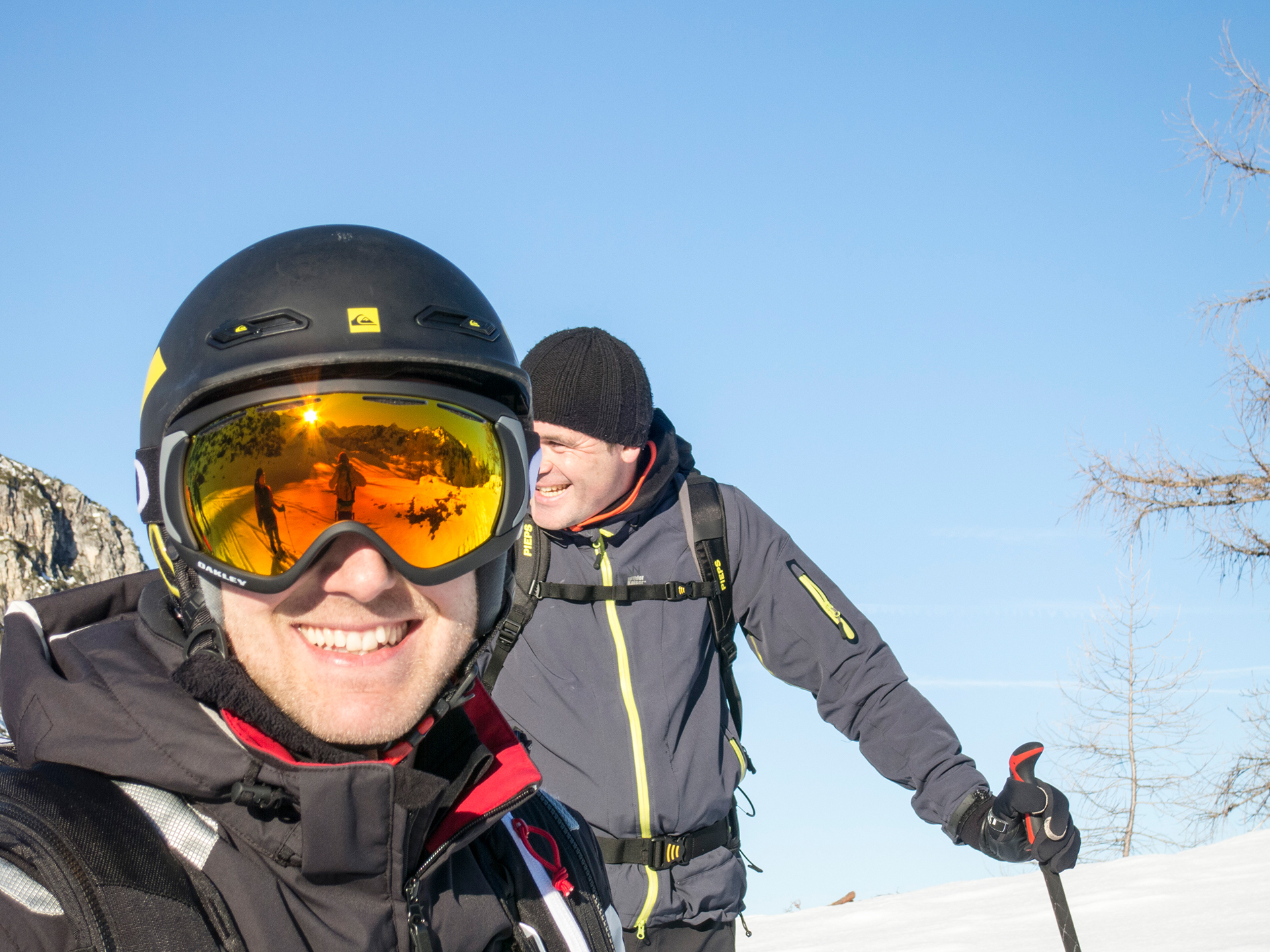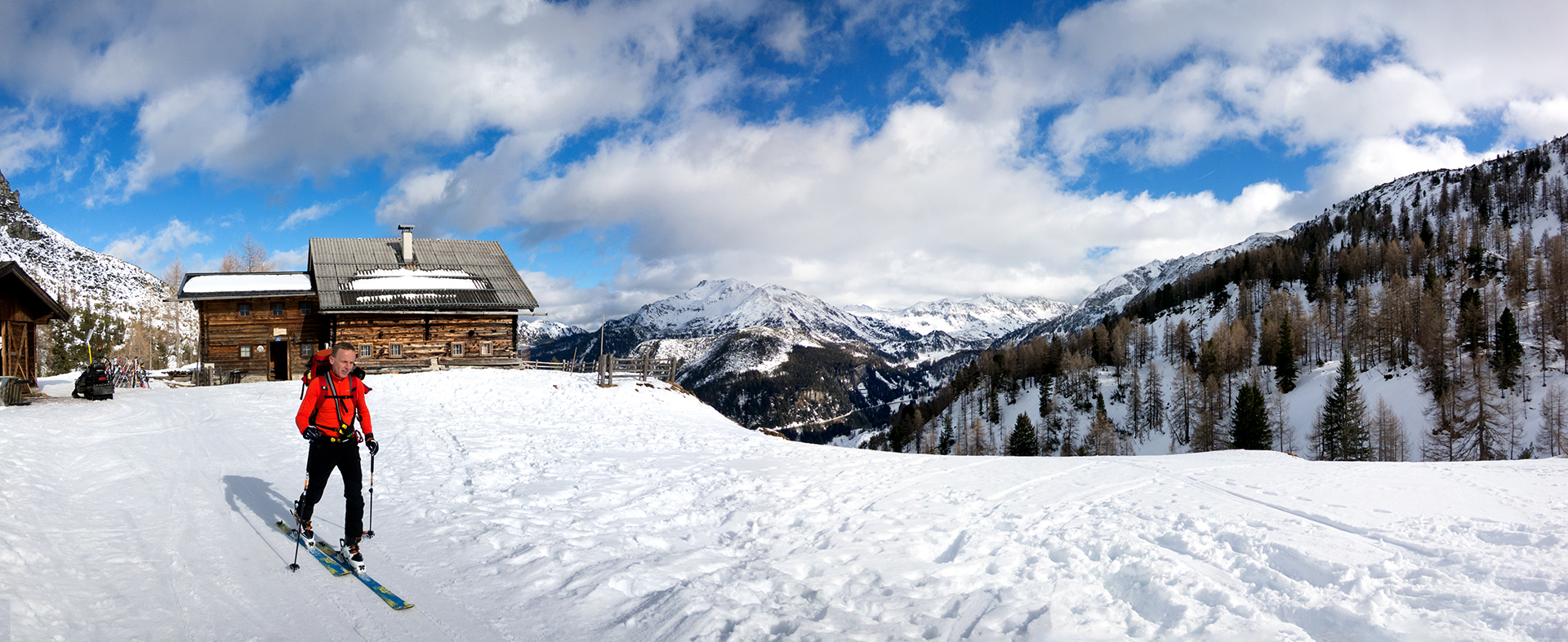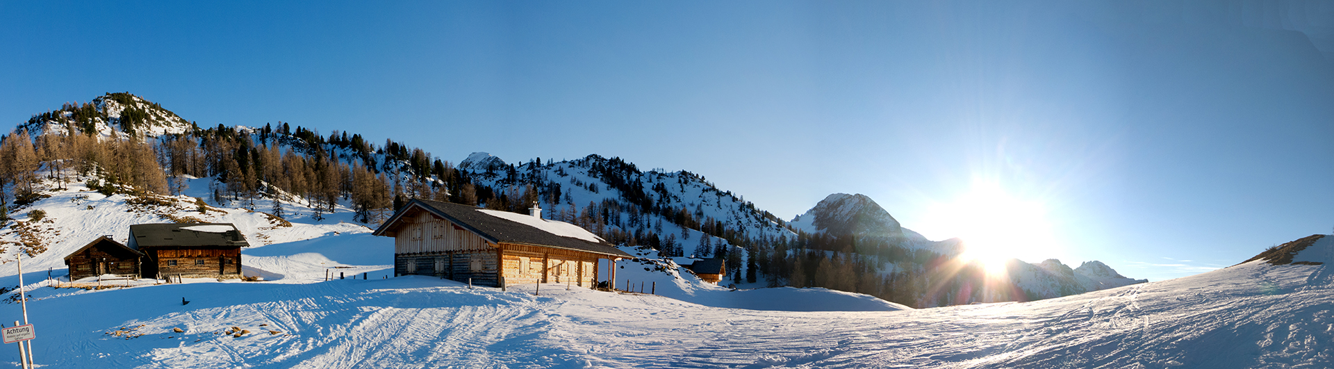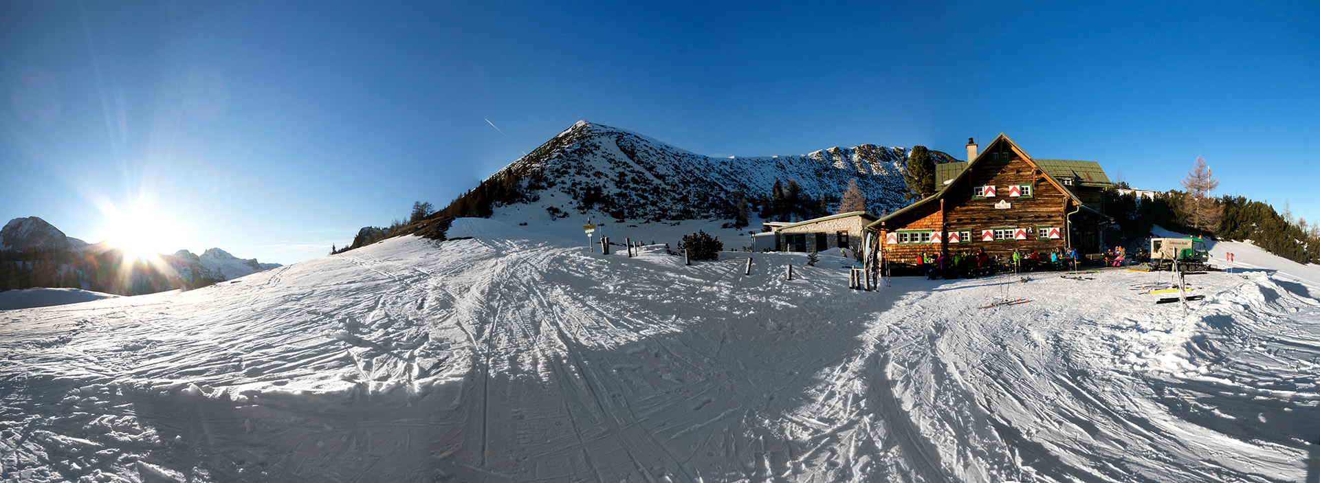 Nachdem alle Rucksäcke erfolgreich ausgegraben wurden, fuhren wir je nach Fahrkönnen entweder auf dem Ziehweg oder im freien Gelände bei genialem Neuschnee zur Gnadenalm ab – unserem Ausgangspunkt. Hier ist das Ausleihen einer kompletten Skitourenausrüstung ganz einfach und ohne Umwege direkt neben dem geparkten Auto möglich.
