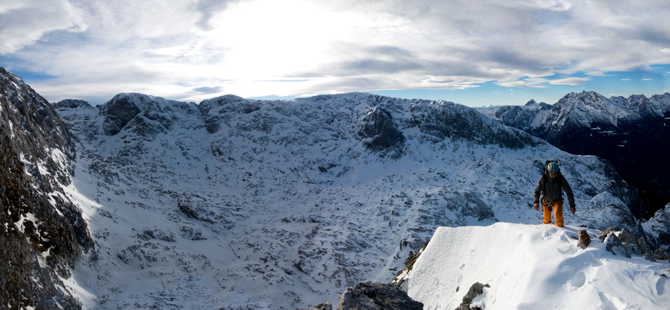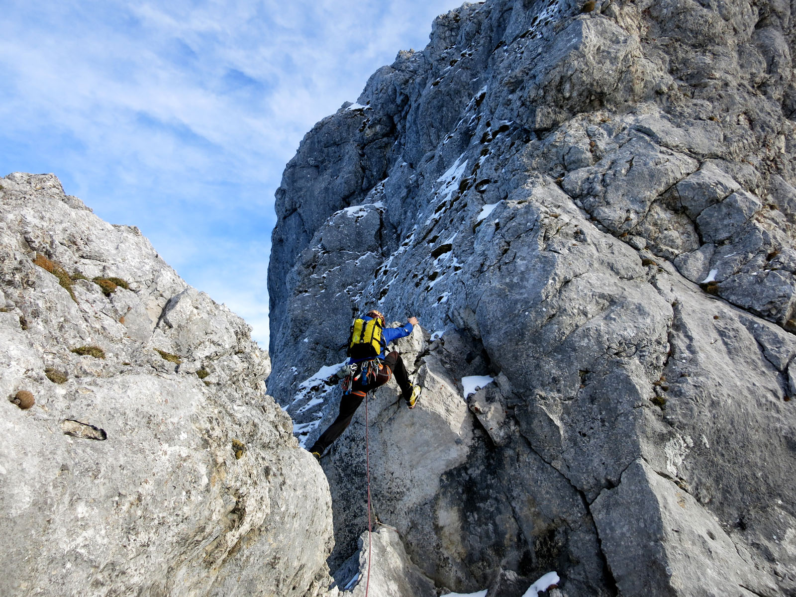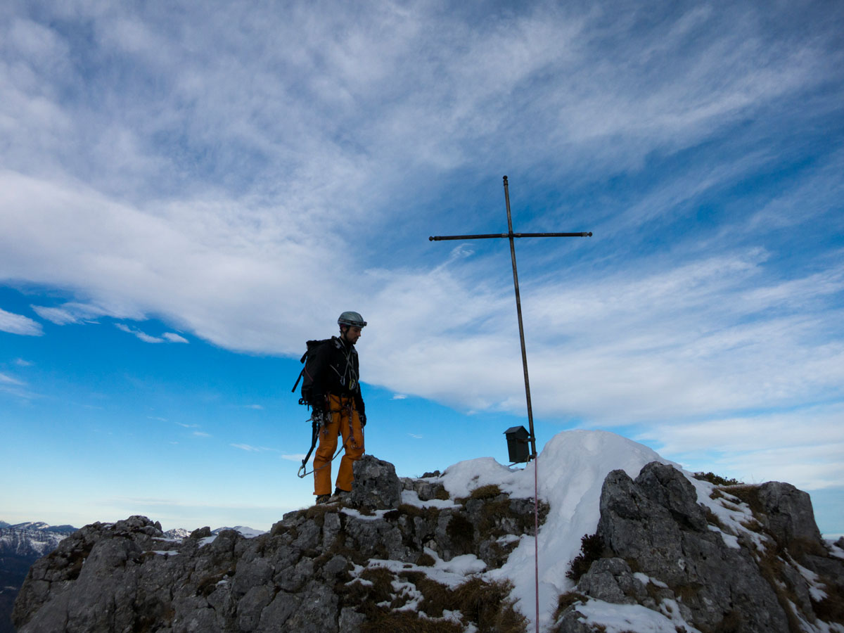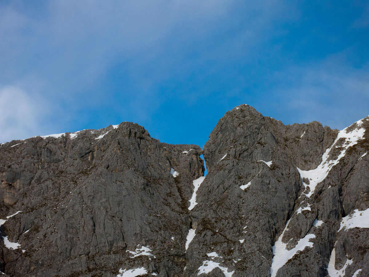 Der nächste Aufschwung wird nach dem AV Führer südseitig umgangen und ergab dadurch genial schneefreies Klettern, an aufgewärmten Kalk, in stimmungsvoller Umgebung. Wieder am Grat angelangt, wurde nur mehr das “Fenster”, mit einem Spreizschritt, zur bewegungstechnischen Herausforderung. Der Weiterweg danach zum Gipfel ist unschwierig und lässt unsere Blicke schweifen.