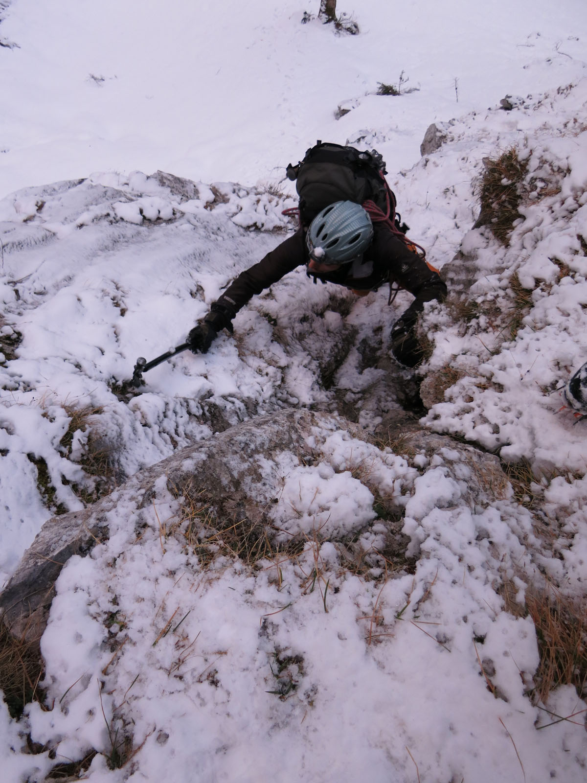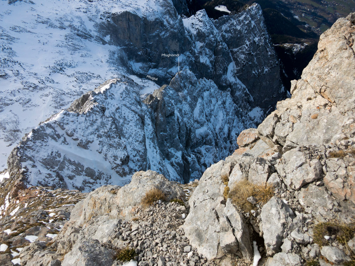 Gespickt mit einigen Mixedstellen und losem Gestein führte uns der Grat direkt auf das ausgesetzte Pflughörndl. Der im AV Führer angeführte Abstieg nordöstlich über Schrofen und eine Steilrinne dürfte der Erosion zum Opfer gefallen sein und somit entschieden wir uns fürs Abseilen über südöstlich senkrechtes Gelände.