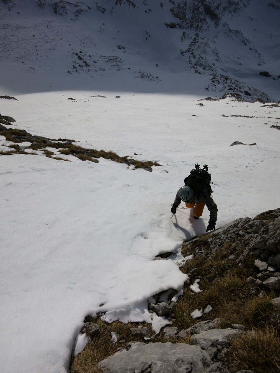 Am Gipfel genossen wir mit einer Tasse Tee die, im Vergleich zu 2010, milden Temperaturen und die beruhigenden Aussichten über den ohne Ski leichten Abstieg. Gleichzeitig mit zwei unerschrockenen Berchtesgadnern starten wir zu Fuß, sie mit Ski und dem Motto “bis das der Stein uns scheidet” den Abstieg respektive die “Abfahrt” über die Umgänge.