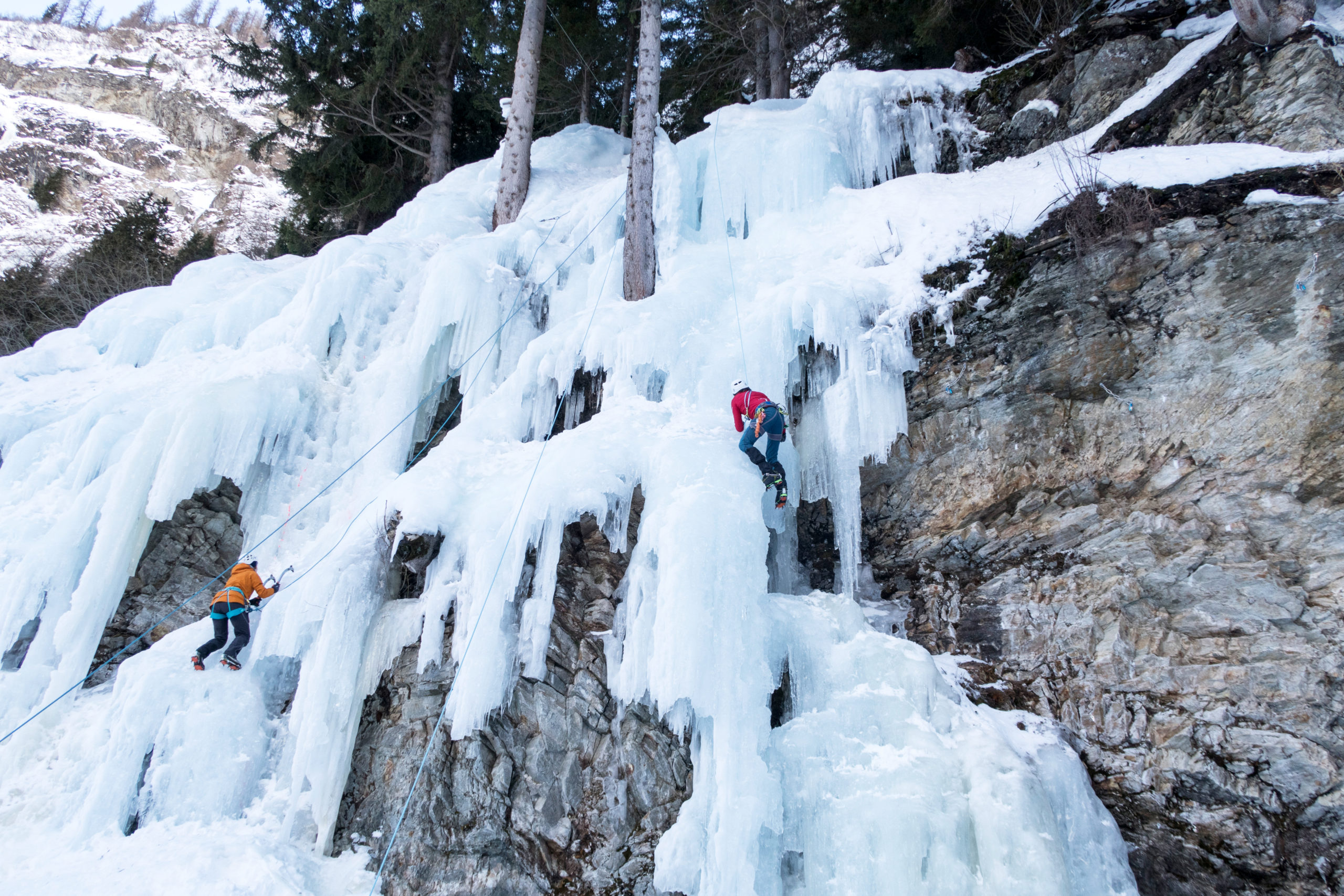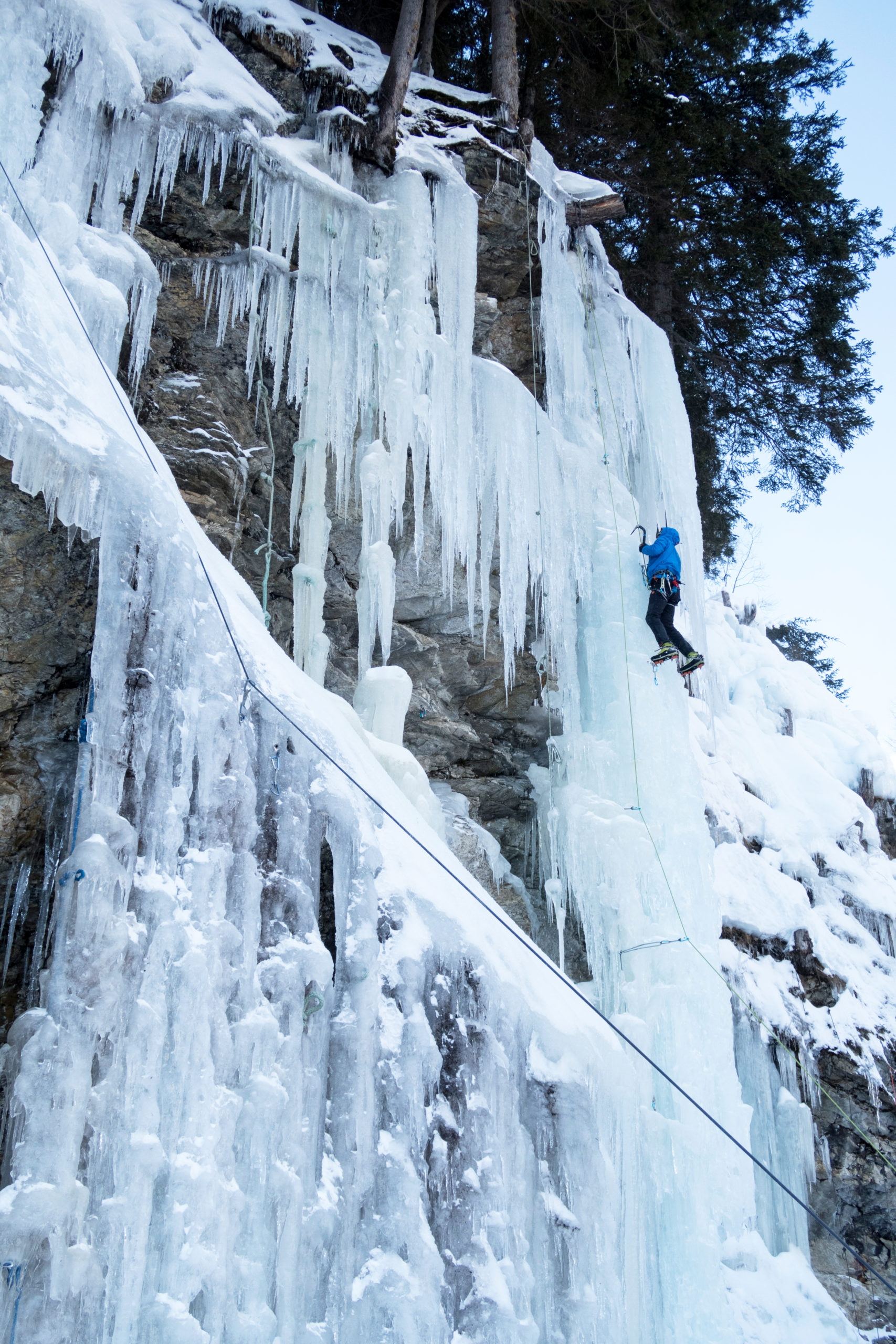 Im Toprope, also mit dem Seil von oben gesichert, kannst du relativ sicher und kontrolliert Einblick in das Eisklettern bekommen. Was du mitbringen solltest ist eine gewisse Grundfitness und warme Kleidung damit du das Eisklettern vollends genießen kannst.
