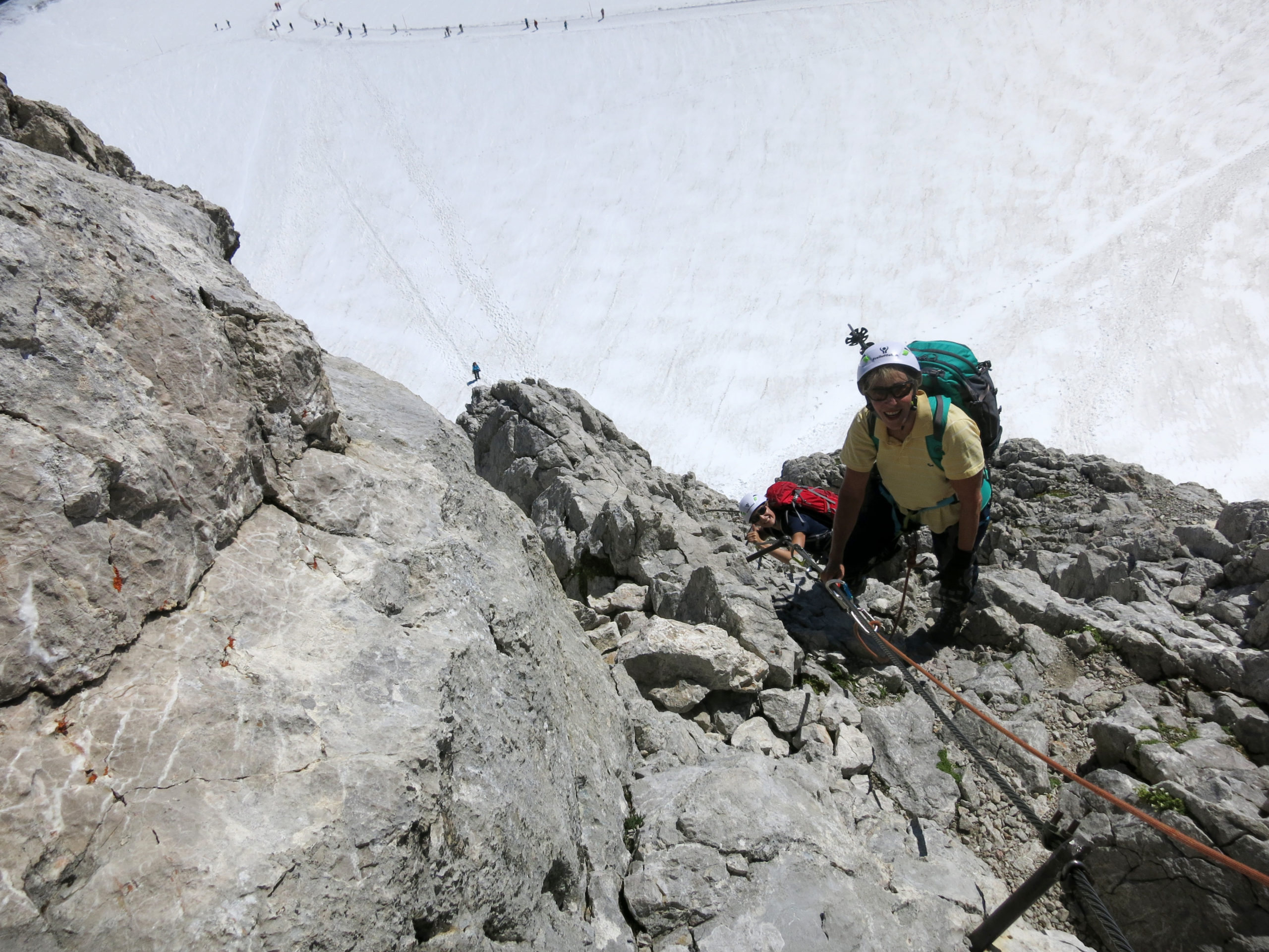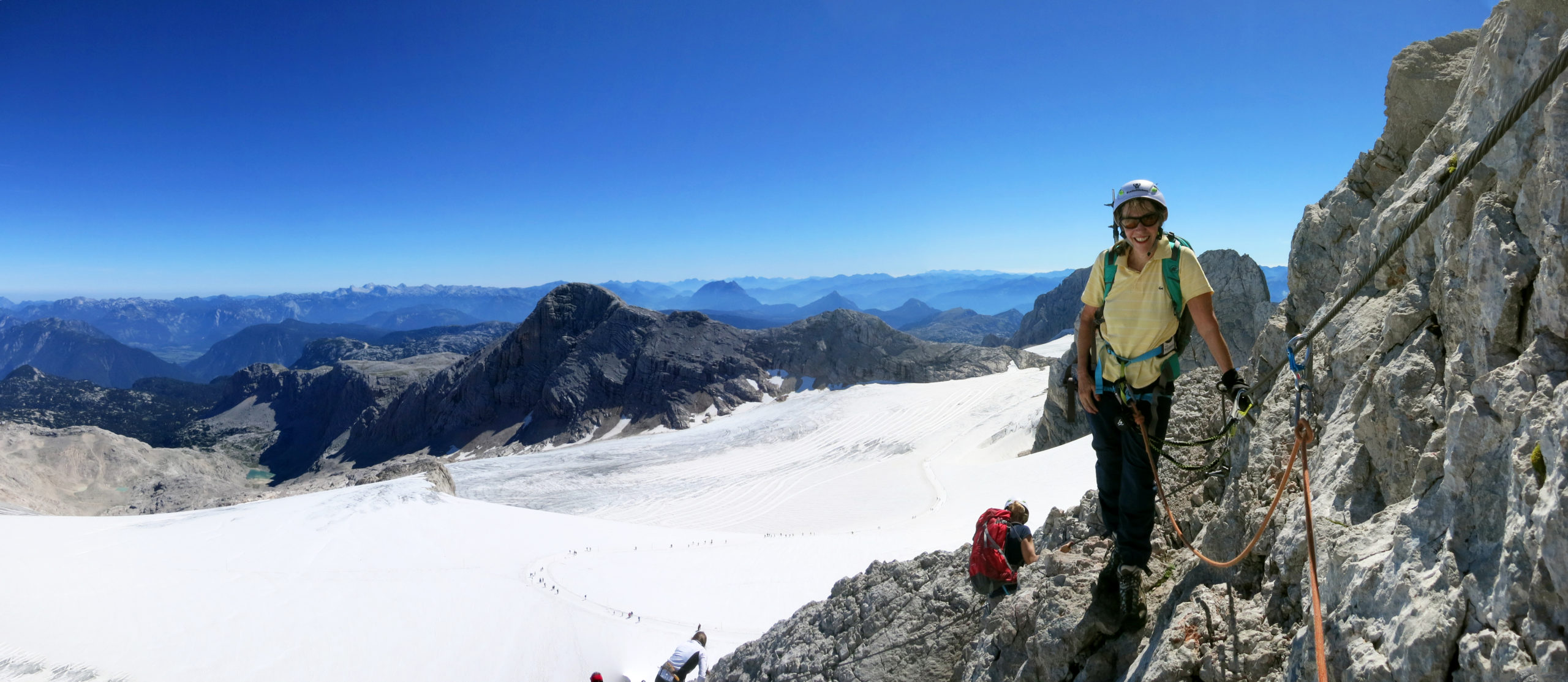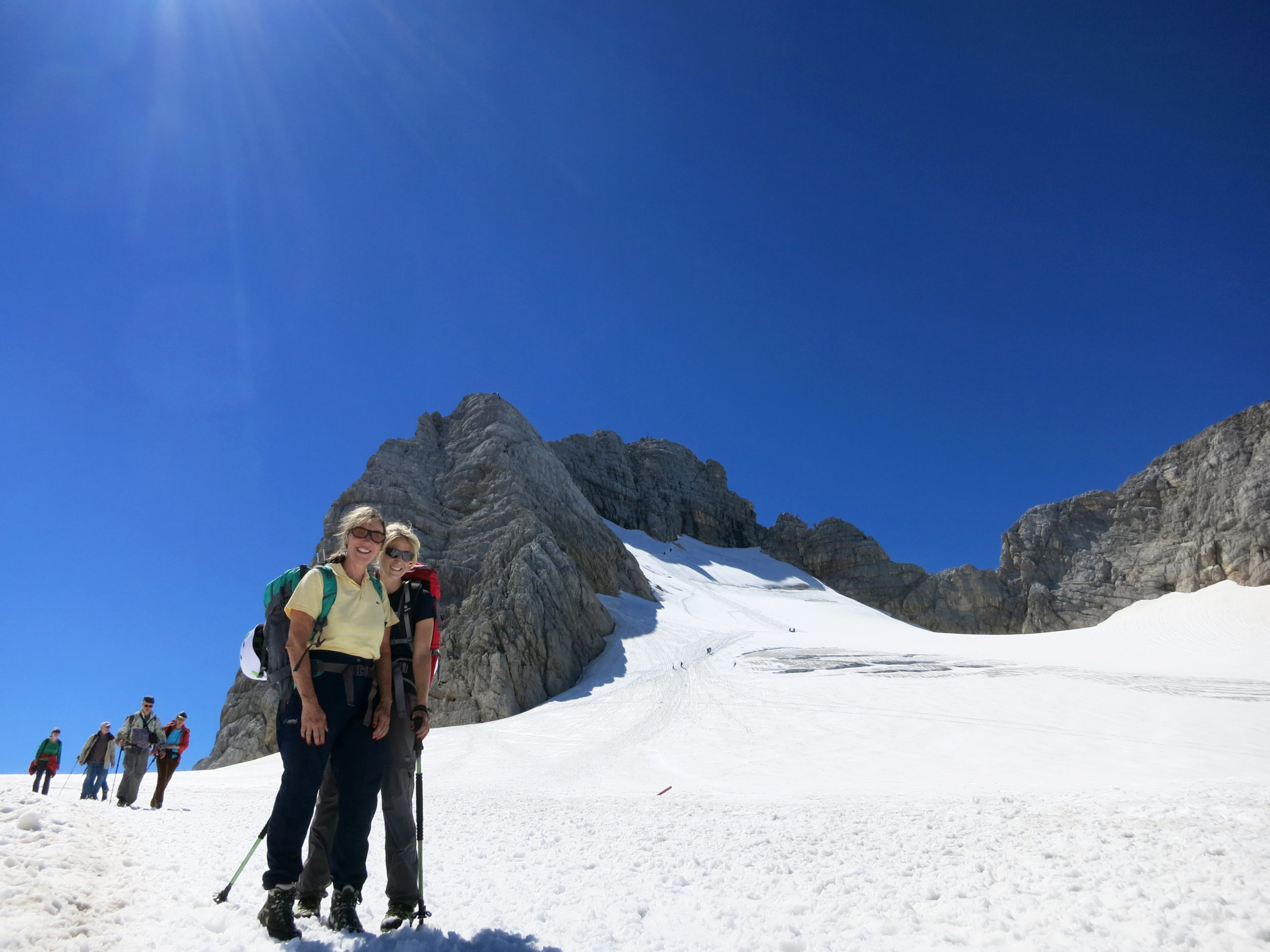 Treffpunkt ist am Morgen der Parkplatz an der Talstation der Dachstein Südwandbahn oberhalb des Ortes Ramsau. Nach der Materialausgabe bzw. dem Materialcheck starten wir die ersten Aufstiegsmeter entspannt mit der Seilbahn und queren weiter über den Hallstätter-Gletscher vorbei an einigen Tagesausflüglern und Gletscherbesuchern. Ab der Seethaler Hütte verlassen wir die präparierte Radtrackspur und steigen in den Schulter-Klettersteig ein. Der Schultersteig (B/C) erspart uns den steilen Randkluftsteig bzw. das Überqueren der großen Gletscherspalte unter dem Dachstein. Gesichert von einer Bergführerin bzw. einem Bergführer kannst du die Kletterei auf den Dachstein genießen und stehst nach ca. 1,5 h auf dem höchsten Punkt der Steiermark (2995 m). Wir steigen über den gleichen Weg wieder ab und kehren entweder bei der Seethaler Hütte oder bei der Gipfelstation der Dachstein Südwandbahn ein, um auf eine tolle Bergtour anzustoßen und genießen das fantastische Panorama. Danach genießen wir den Seilbahn unterstützten Abstieg bevor wir uns verabschieden und die Heimreise antreten.