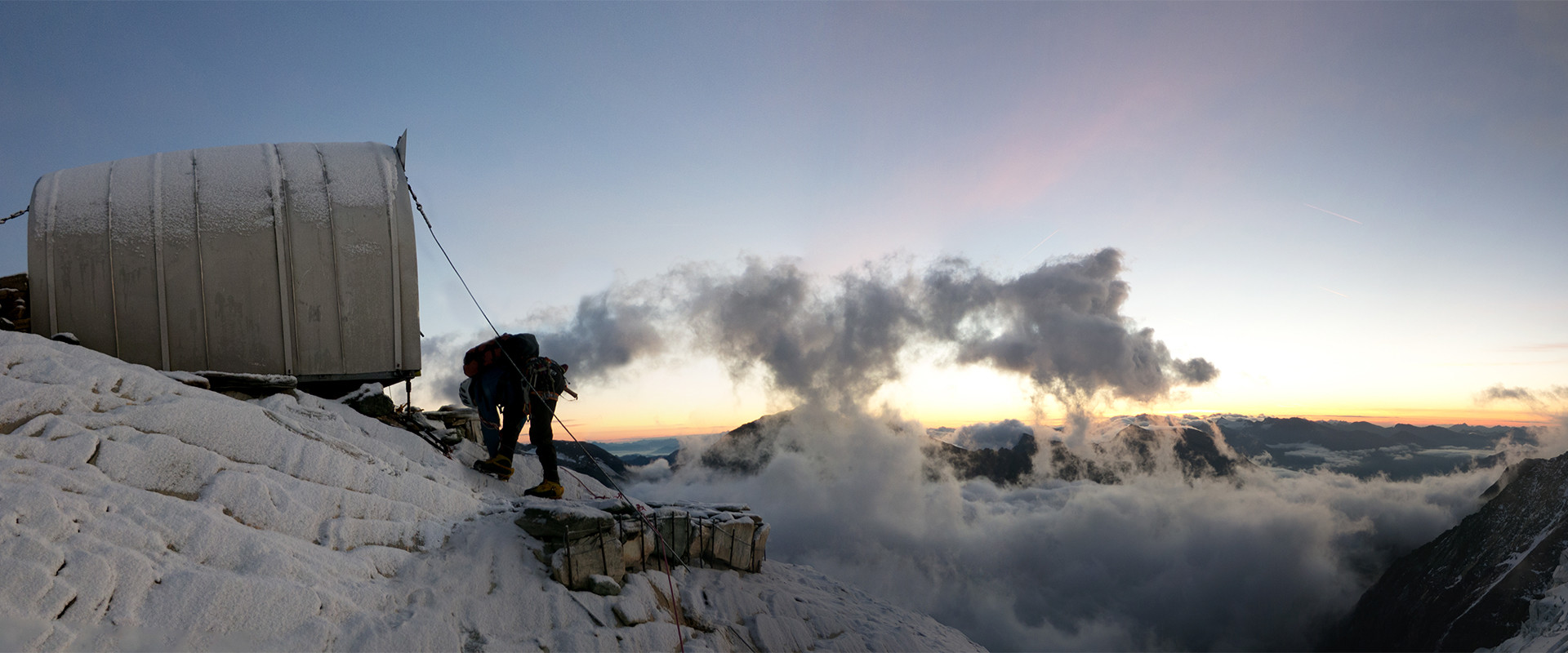 Treffpunkt ist zu Mittag das Parkhaus Franz-Josefs-Höhe (2370 m). Gemeinsamer Zustieg und Materialcheck. Zuerst geht es einige Meter abwärts zu der mittlerweile weit zurückgezogenen Pasterze. Wir gehen die flache Pasterze entlang und dann immer steiler werdend über Geröll und Gletscher empor. Mit Steigeisen und Seil gesichert führt der Weg über das spaltenreiche Glocknerkees zur Großglockner Biwakschachtel auf 3205 m. Von hier genießen wir den Großglockner von seiner wilden und imposanten Nordseite.