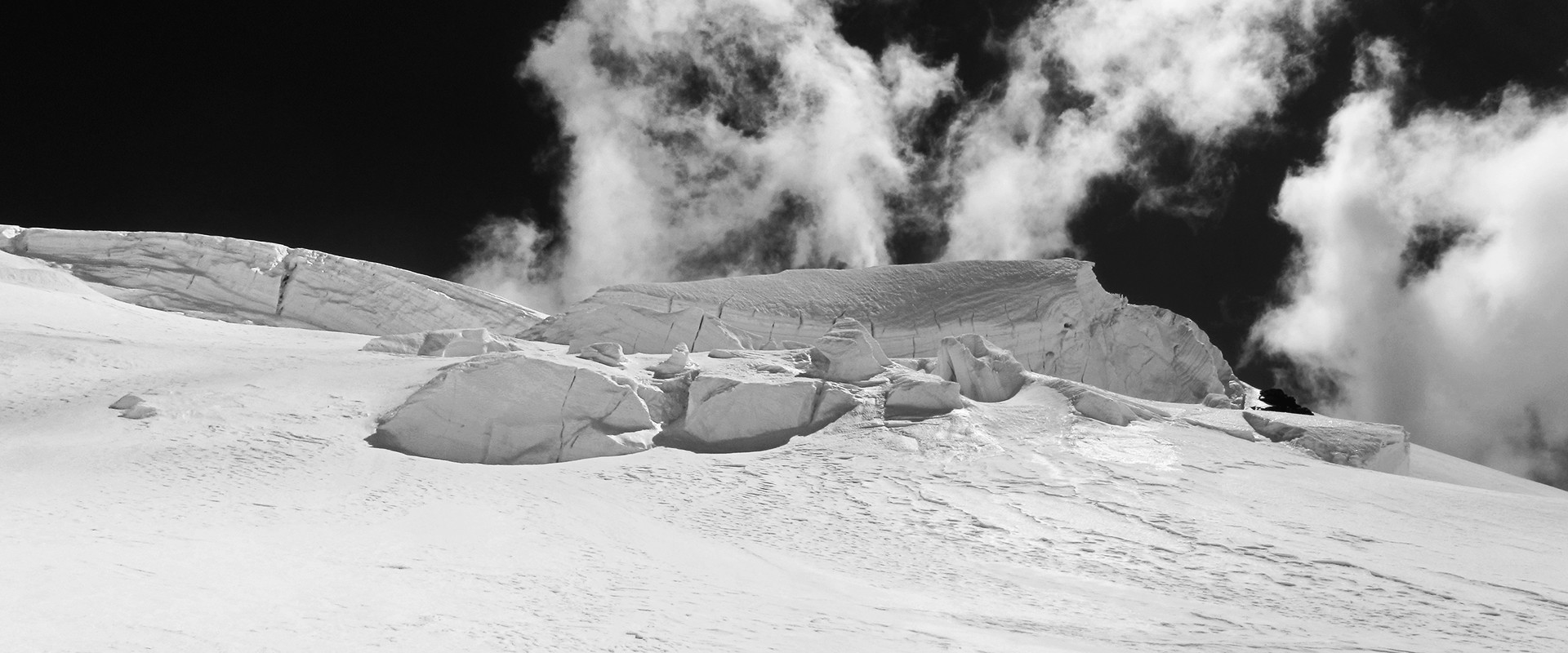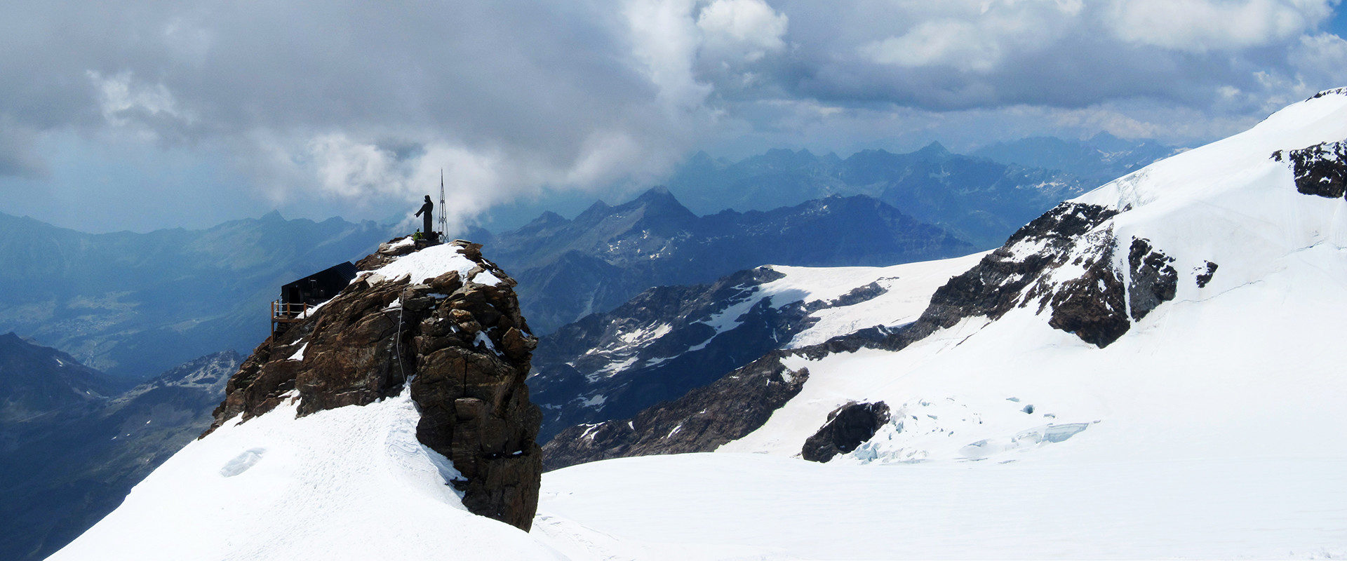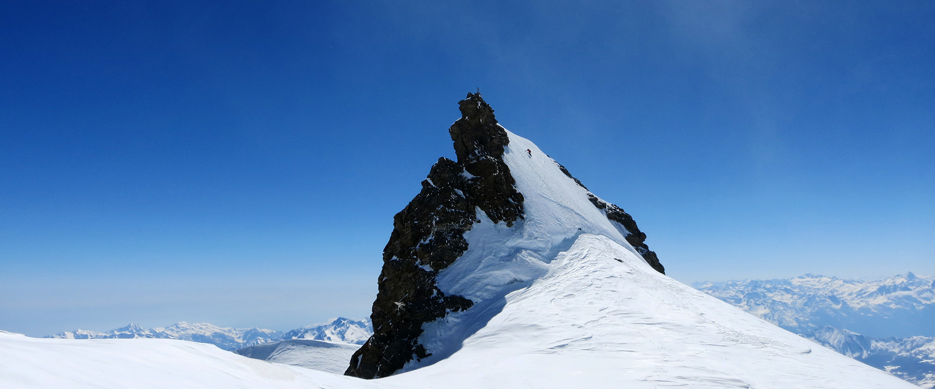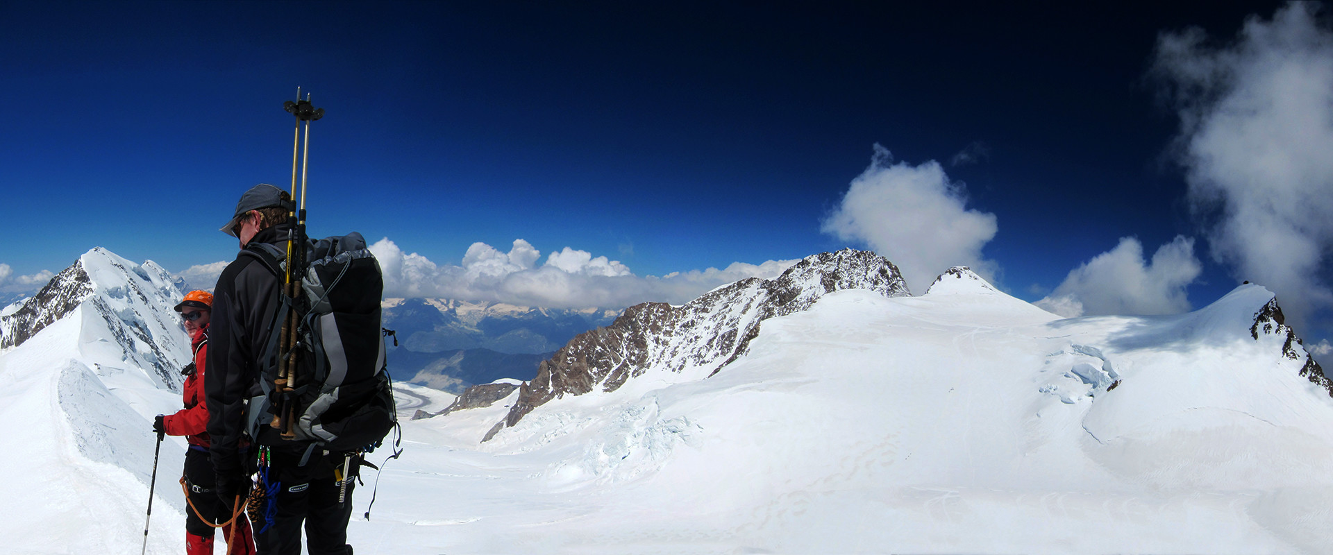 Heute queren wir lange Zeit über den flachen Gletscher unter dem eindrucksvollen Liskamm vorbei und überschreiten den Passo Il Naso (4150 m). Von hier geht es weiter über das Balmenhorn (4167 m) und die Vincent- Pyramide (4215 m) und schlussendlich hinab zur Gnifetti Hütte.
