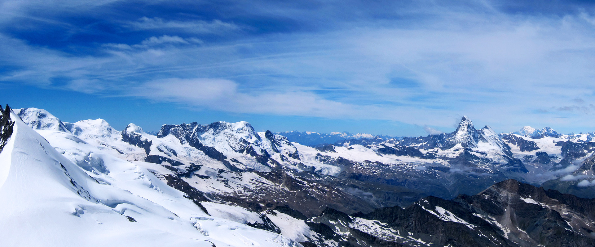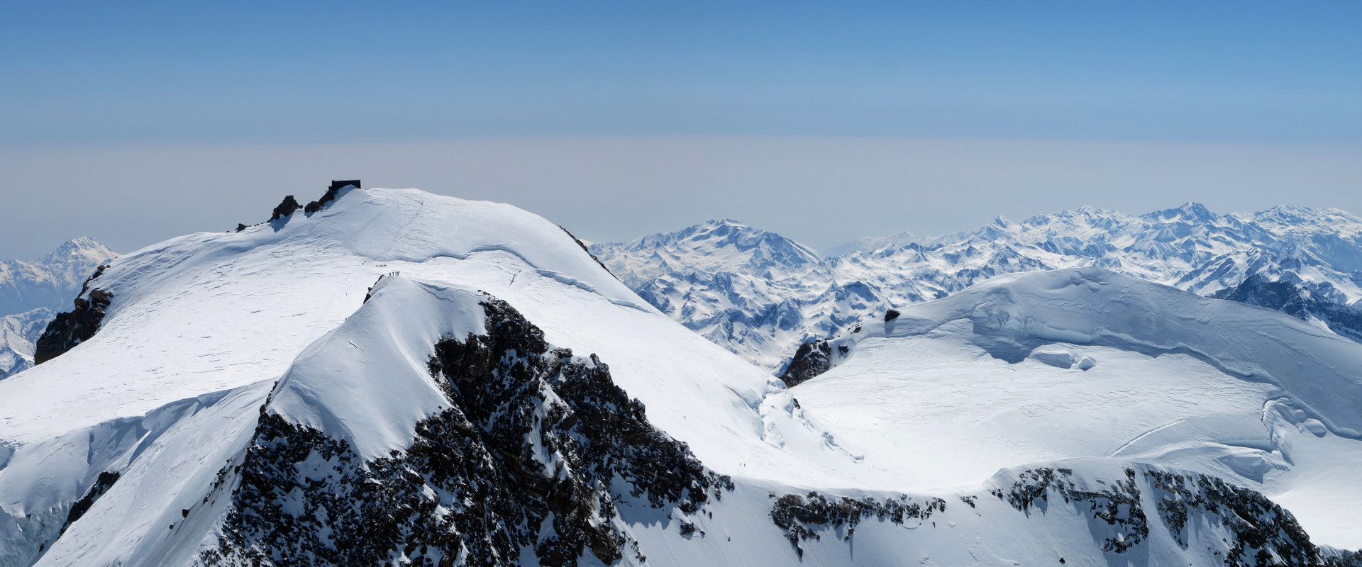 Mit dem Zug oder dem Hoteltaxi fahren wir nach dem Frühstück in den Ort Zermatt, wo wir erstmal das Matterhorn von seiner eindrucksvollen und bekannten Seite sehen können. Gemütlich bummeln wir durch die lieblichen Gassen, die leider vom Kommerz nicht verschont geblieben sind, vorbei an Gucci, Prada und Lacost. Mit der Bahn geht es flott auf das Kleine Matterhorn (3883 m) von welchem wir die Besteigung bzw. die Überschreitung des Breithorns (4164 m) starten. Weiter geht es über das sanfte Gletscherplateau auf den Roccia Nera und wenn es die Zeit und Kraft noch zulässt auch auf den Pollux (4092 m), bevor es abwärts zum, auf der italienischen Seite befindlichen, Refugio Guide d’Ayas geht (3420 m).