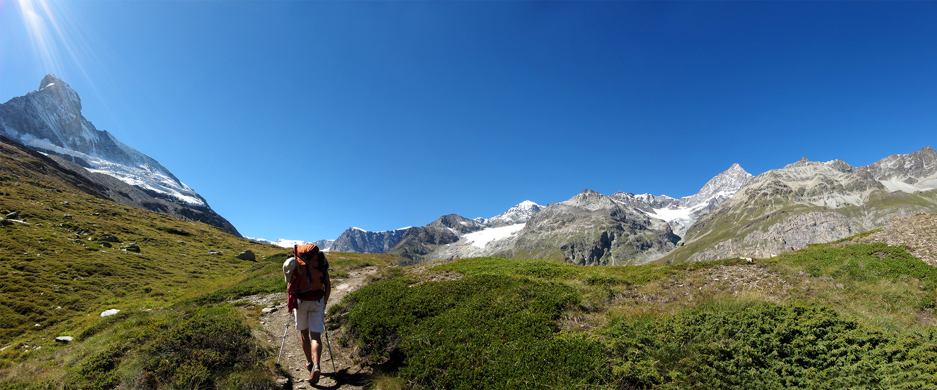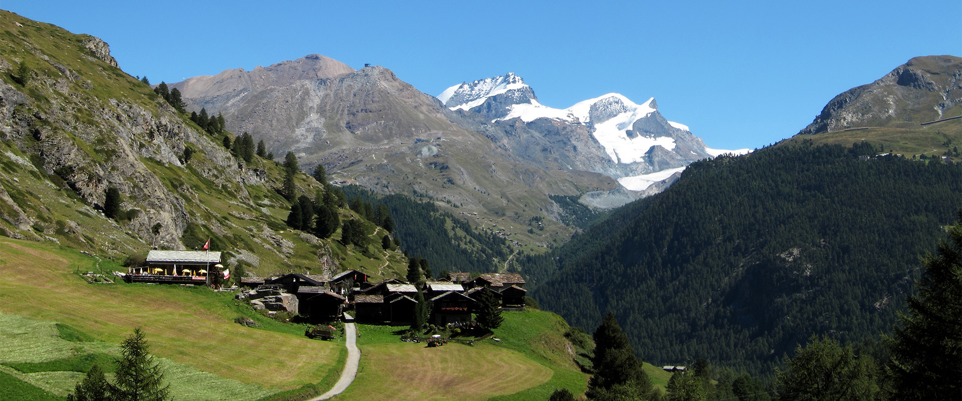 Mit dem Zug oder dem Hoteltaxi fahren wir nach dem Frühstück in den Ort Zermatt, wo wir erstmal das Matterhorn von seiner eindrucksvollen und bekannten Seite sehen können. Gemütlich bummeln wir durch die lieblichen Gassen, die leider vom Kommerz nicht verschont geblieben sind, vorbei an Gucci, Prada und Lacoste. Je nach Wanderslust fahren wir entweder mit der Bahn bis zur Station Schwarzsee und genießen die Kulisse der Viertausender mit Bergsee oder beginnen den Aufstieg zu Fuß am tief eingeschnitten Zmuttbach entlang in Richtung dem kleinen Bergdörfchen Zmutt. Immer das Matterhorn vor Augen geht es über Almwiesen und Lärchenwälder empor zur neu errichteten Hörnlihütte. Von hier haben wir eine beeindruckende Aussicht auf unzählige Viertausender dieses Talkessels.