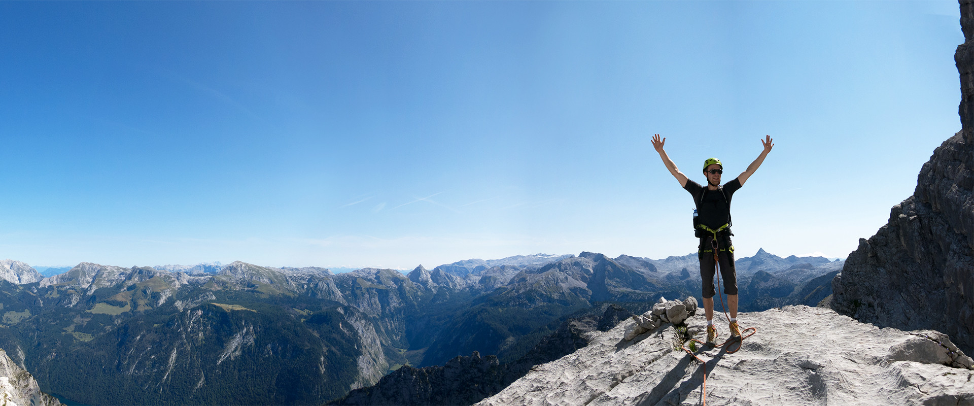 Die Watzmann Ostwand ist mit ihren 1800 Höhenmetern die längste Wand der Ostalpen. Schon die Bootsfahrt nach St. Bartholomä, unserem Ausgangspunkt, und das Ambiente rund um diese Wand macht diese Unternehmung zu einem ganz besonderen alpinen Erlebnis. Unsere Route ist der „Berchtesgadener Weg“ , der wohl bekannteste Anstieg in dieser Wand. Es erwarten dich Kletterschwierigkeiten bis maximal 3b. Die Herausforderung liegt dadurch nicht in der absoluten Kletterschwierigkeit, sondern vielmehr in der Länge der Tour. Es gilt auf den 3000 m dieser Route Konzentration zu bewahren und vor allem im leichten Gelände sicher unterwegs zu sein. Um dir die größtmögliche Sicherheit zu bieten, bist nur du alleine mit einer/einem ortsansässigen und erfahrenen Bergführerin / Bergführer unterwegs.