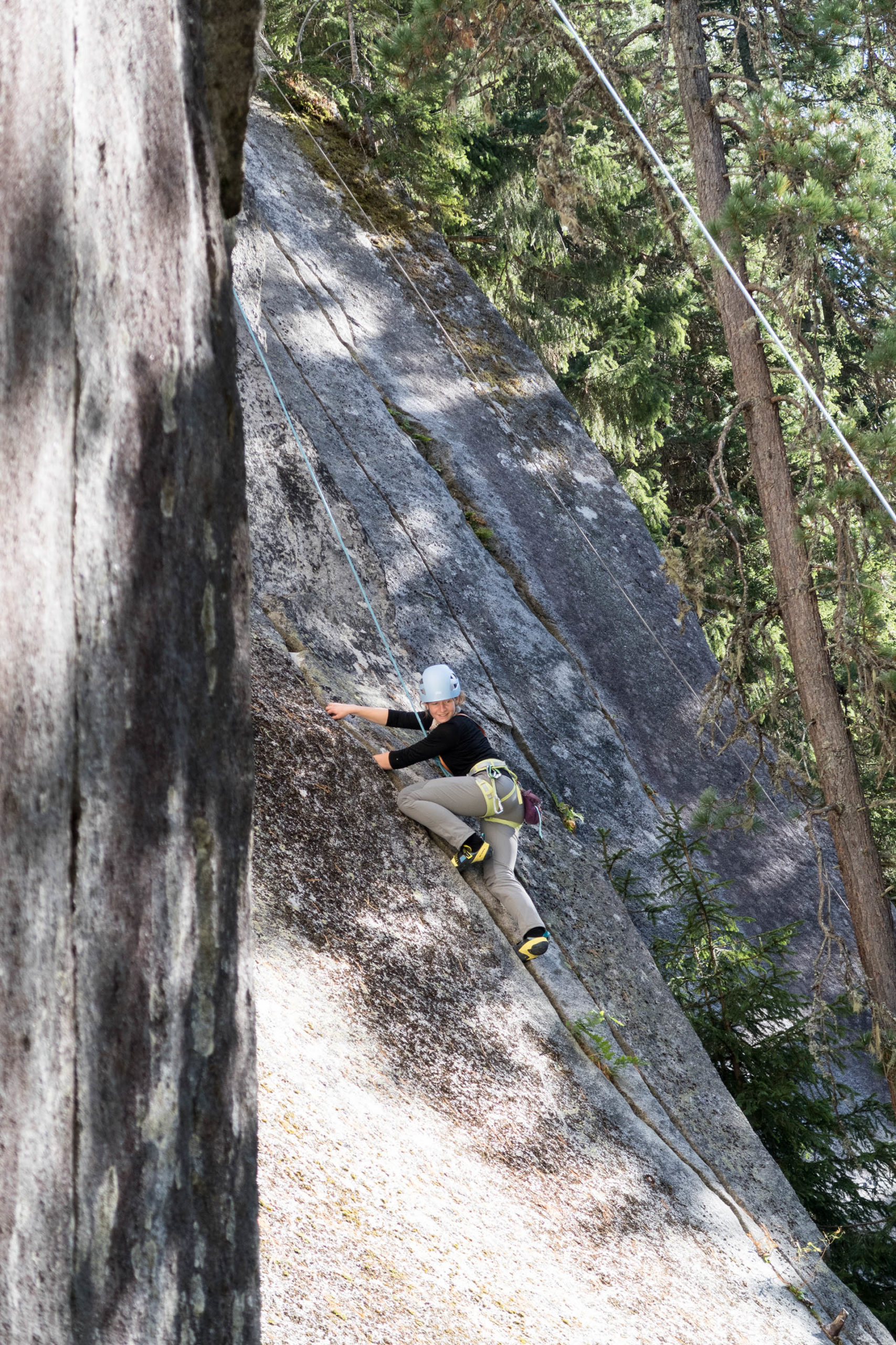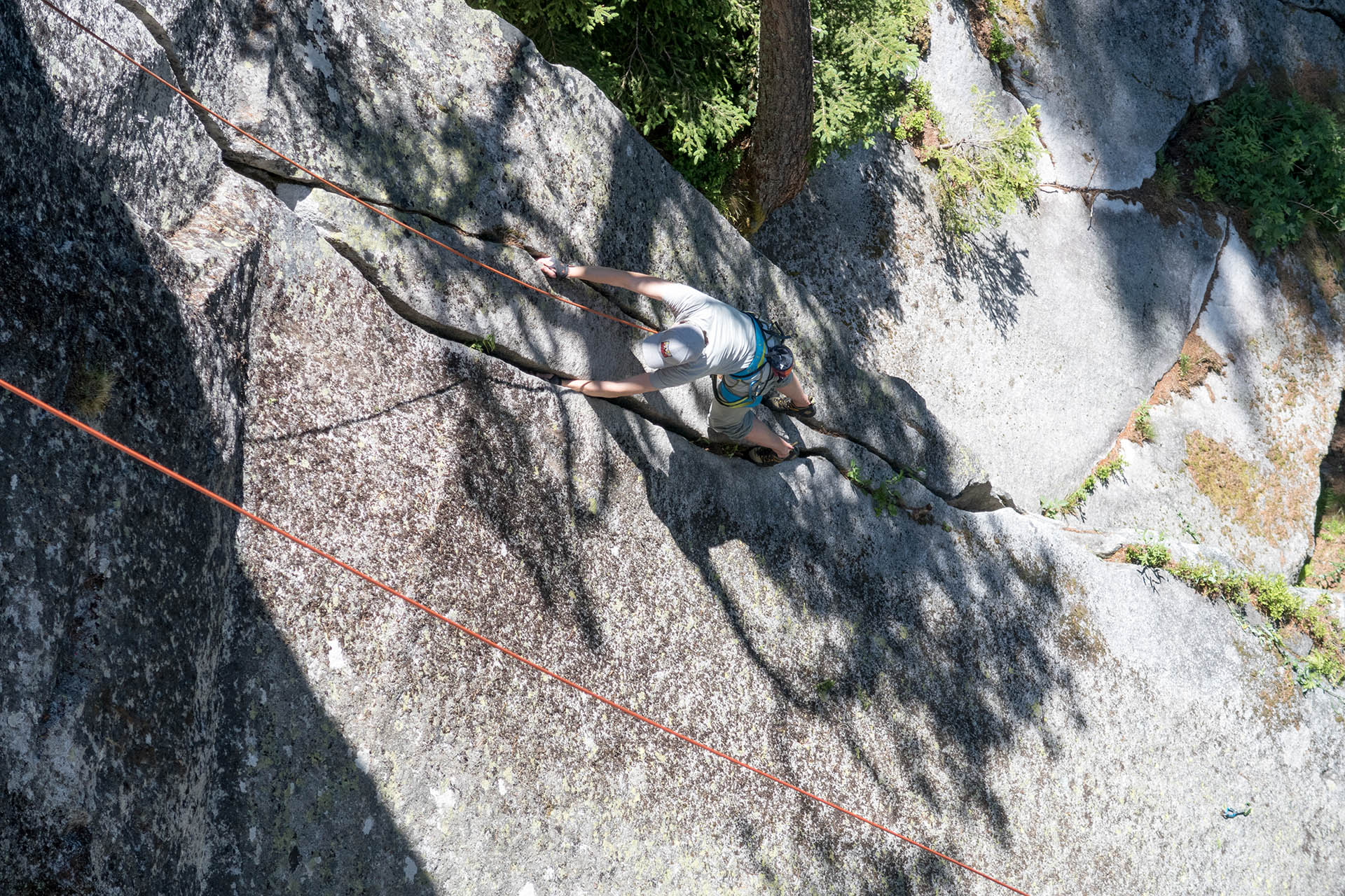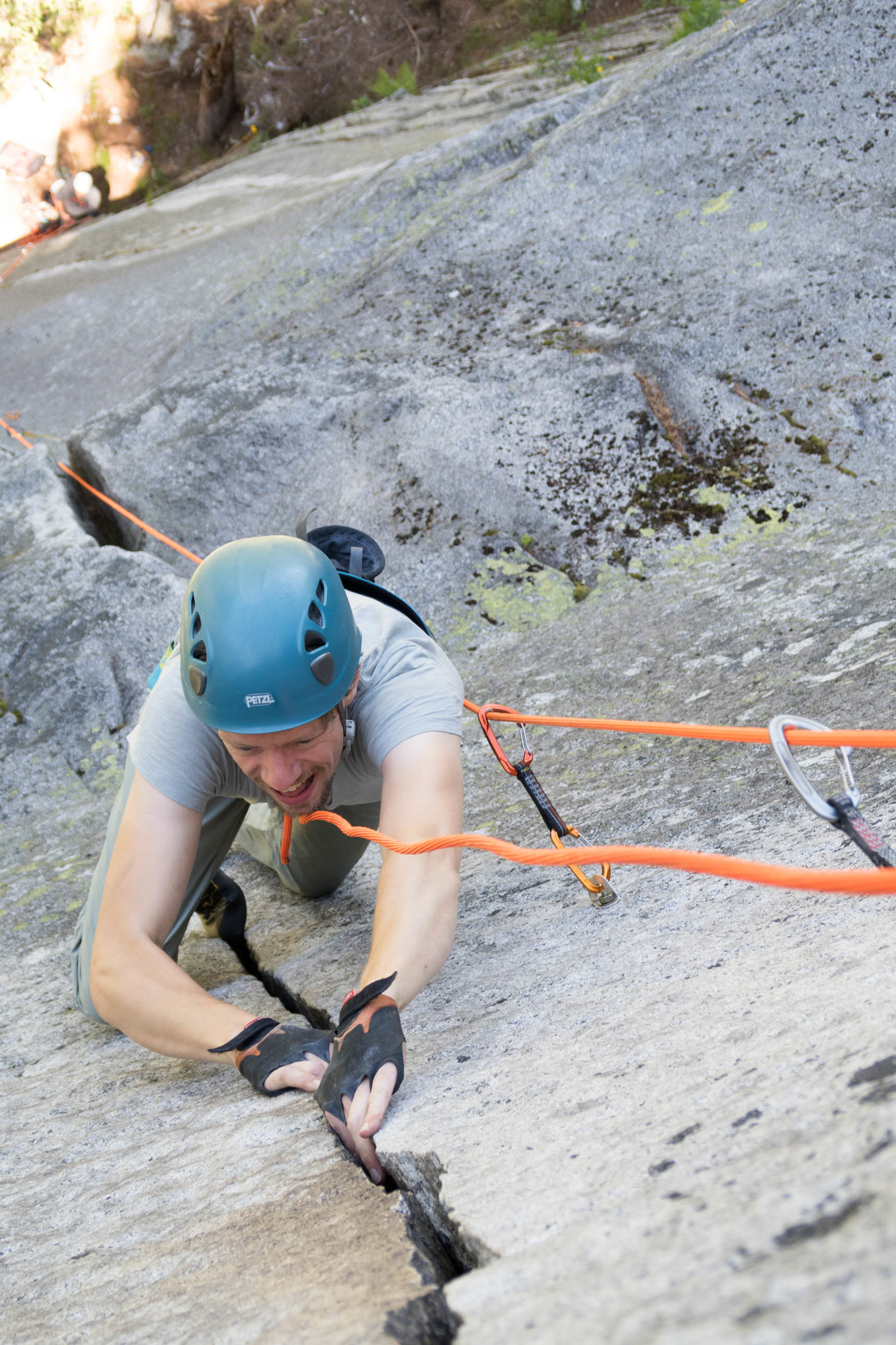 Das Rissklettern kann getrost als eigenständige Kletterdisziplin bezeichnet werden. Hierbei greift, steigt und bewegt man sich auf erfrischend ungewohnte Weise. Ohne Kenntnis der speziellen Techniken stößt man als Neuling oft schon bei Routen weit unter seinem Niveau auf unlösbar erscheinende Probleme. Gelingt einem aber das Verklemmen der Hand im Riss, wird man den Reiz dieser Art des Kletterns entdecken und als Erweiterung seines Bewegungsrepertoires schätzen lernen. Das im Zuge des Risskletterns an diesen wunderbaren Gneis und Granitrissen mit mobilen Sicherungsmittel geübt und vertrauen aufgebaut werden kann, ist eine perfekte Ergänzung dieses Kurswochenendes.