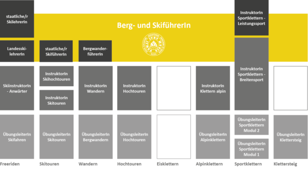 je nach Ausbildung und Bergsportdisziplin von unten nach oben ansteigend dargestellt.